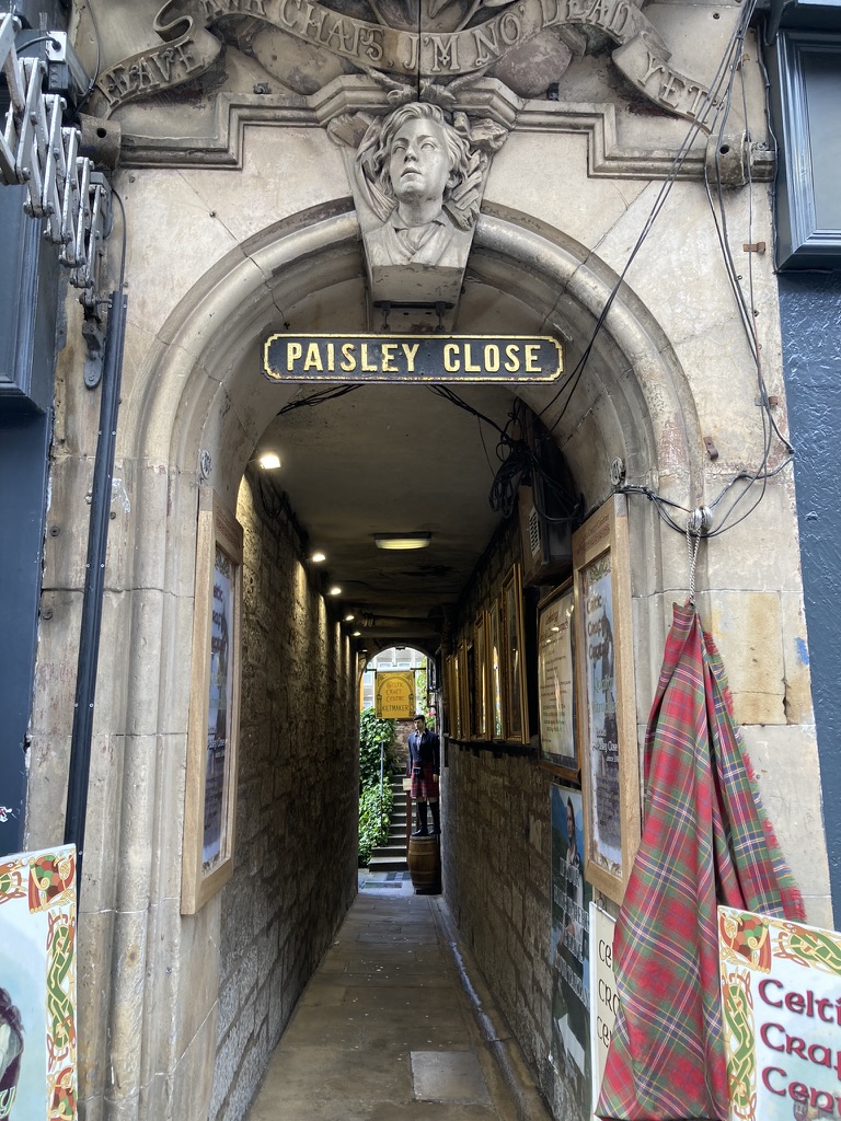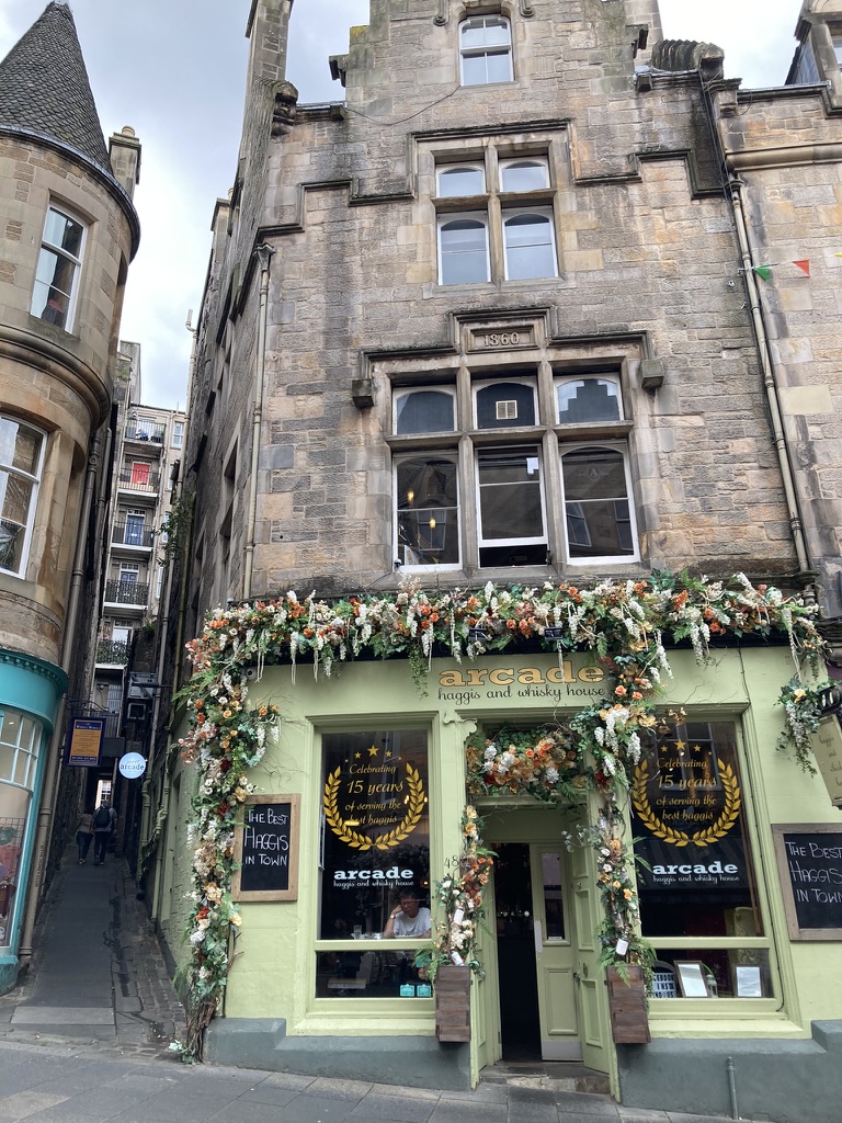 Just as I’ve picked out my little sandwich and am about to order a coffee, I see a sign saying that their bathrooms are temporarily closed. Great. I hand mom my armful of things and say I’ll be right back. It’s raining, so instead of following the street back up to the Royal Mile, I duck into a covered walkway where there are restaurants and shops because it looks like it comes out on the other side. I’m right! See? Edinburgh has all these little corners, and it shows you the way. I make a mental note to come back to this street after lunch. It winds steeply down towards New Town and it looks like it has some seriously cute shops. Put a pin in that.