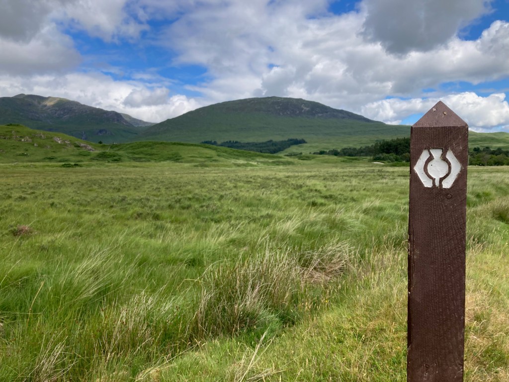 Leaving Glencoe and getting back on trail, we can see the ribbon of the WHW for miles. Mash points out a cluster of buildings in the distance that looks like it can’t be more than a quarter of a mile away. “That’s Kingshouse. It’s a mile and a half.” We can also see nearly towards the steep section called Devil’s Staircase, which is still a ways in the distance. My perception of space is warped here. When you look out towards the hills it seems like you could almost touch them, but focus closer, on the rise and swell of the bog lands, and it becomes clear how far away everything really is.