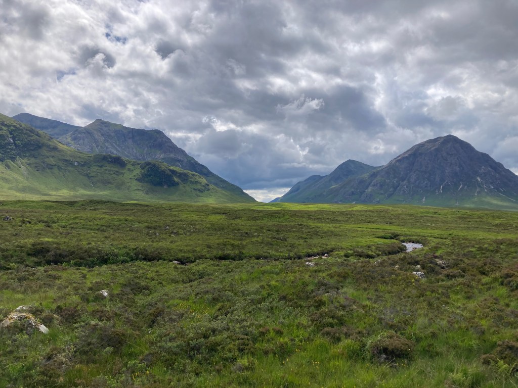 We continue walking through Glencoe. Huge mountains tower around us. Rain threatens, and breaks for a few moments, and disappears again. We start up the Devil’s Staircase. The name seems like an overstatement to me, given how short the section is and how much less intense it seems than the AT. But before long I find myself breathing hard. It’s supposedly switchbacked, but they’re very narrow, worn-in, and rocky switchbacks. I stop every few minutes and turn around to take in the changing view of the sweeping valley beneath us.