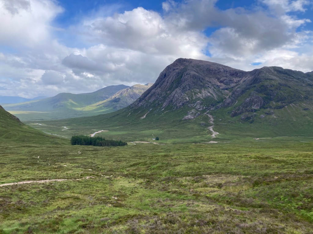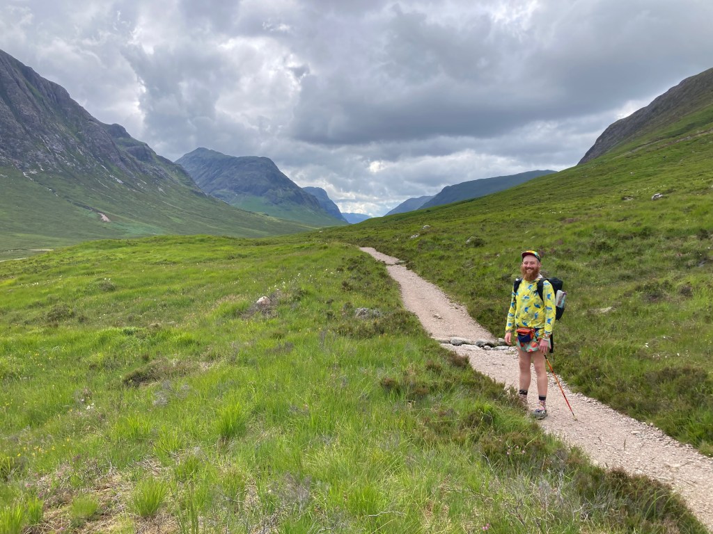 As we begin the long descent to Kinlochleven, Mash tells me about his studies in geology, including a project for his thesis where he and a group spent some time in a remote area of Scotland. I ask if studying geology still influences his perspective, especially while hiking. “Oh, yeah,” he replies, and begins telling me about the landscape from a geological standpoint. This isn’t an area of study that has staying power in my mind; it’s hard for me to grasp and the concepts sort of slide right off. But it is really interesting to consider the specifics of how features of this place were formed. It reminds me of how I started seeing the woods around my home differently during COVID once I started getting into mushroom foraging. When you’re looking for mushrooms, you have to know what trees to look for, and where to find those trees. A side effect of trying to find things to eat in the woods is that you notice so many more intricate details of what’s growing: the way some bark looks, the patterns and number of leaflets, the names of certain wildflowers and where and when they tend to grow. It’s like having another set of eyes—for a moment, I see this particular world through those of a geologist.