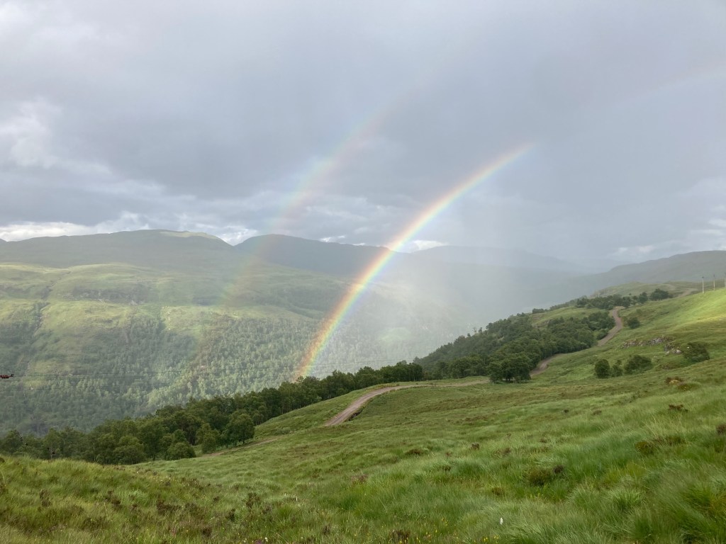 It starts raining as we go down, then it stops, then it starts and stops again. At one point I stop and see a spectacular double rainbow arching its way down towards the valley below. Between the mountains, the shimmering green, and this rainbow, it’s an unreal sight.