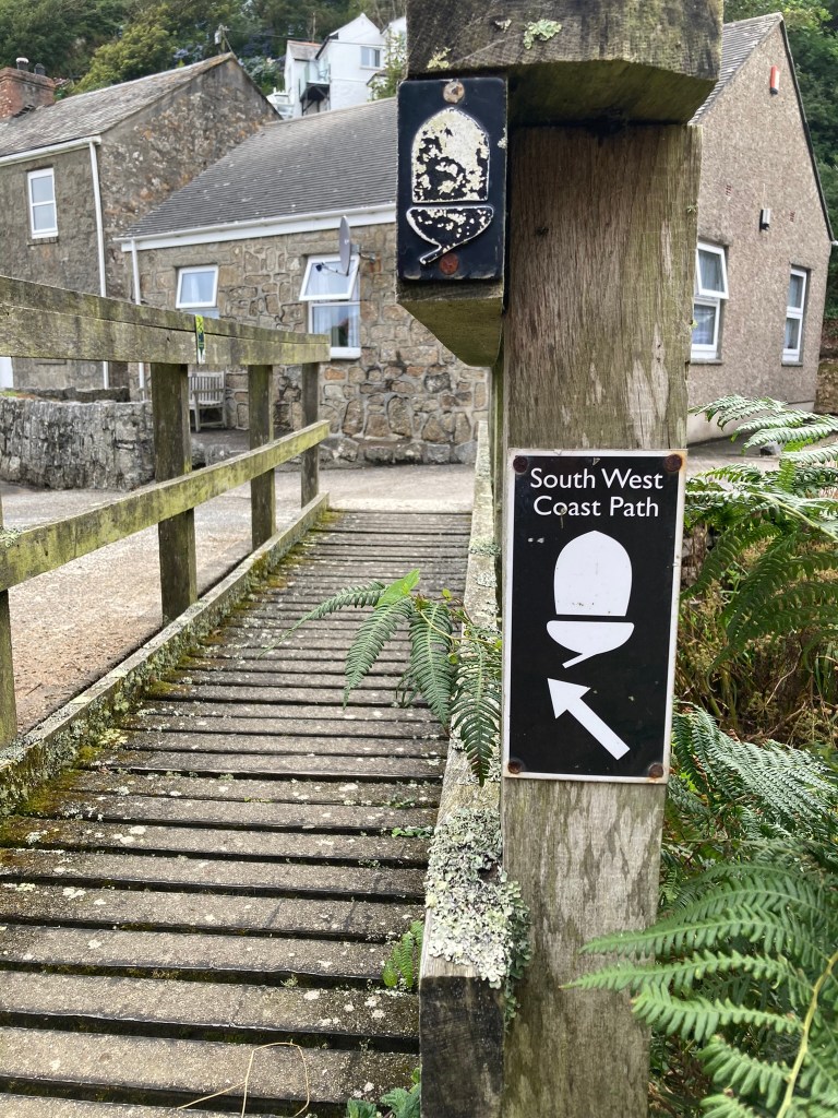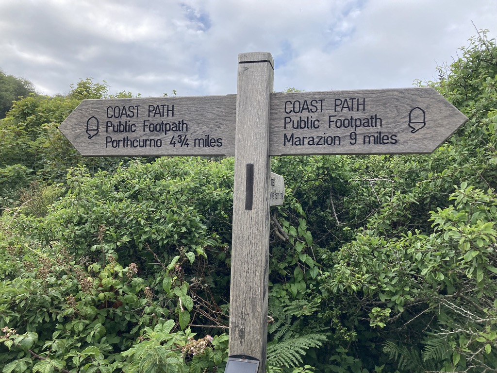 I continue down the trail along the cliff’s edge, entering some overgrown bits again, then strolling down the open hill as it leads to the town. Two guys pass me and ask how far it is to Mousehole and what the trail is like. I say two miles, which is a little off because a sign I see five minutes later says 2.5, and I say honestly that a lot of it is overgrown, but the views are beautiful.