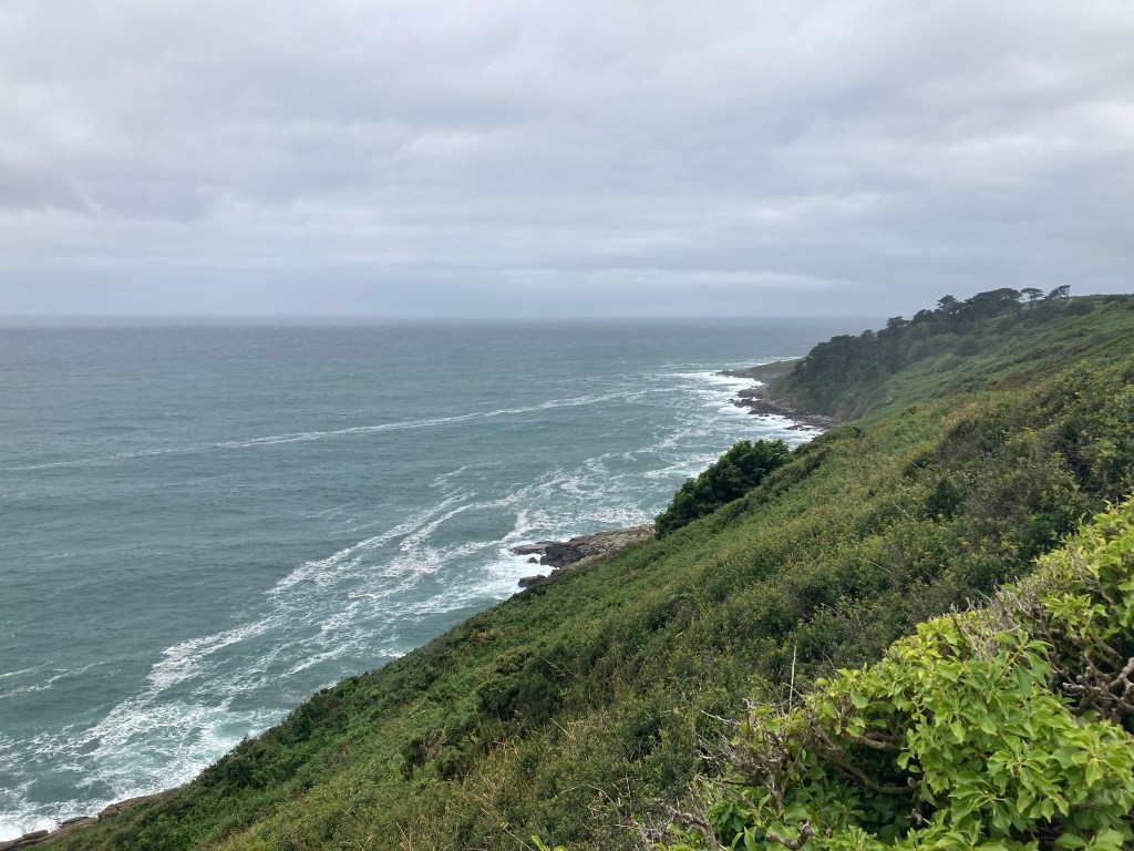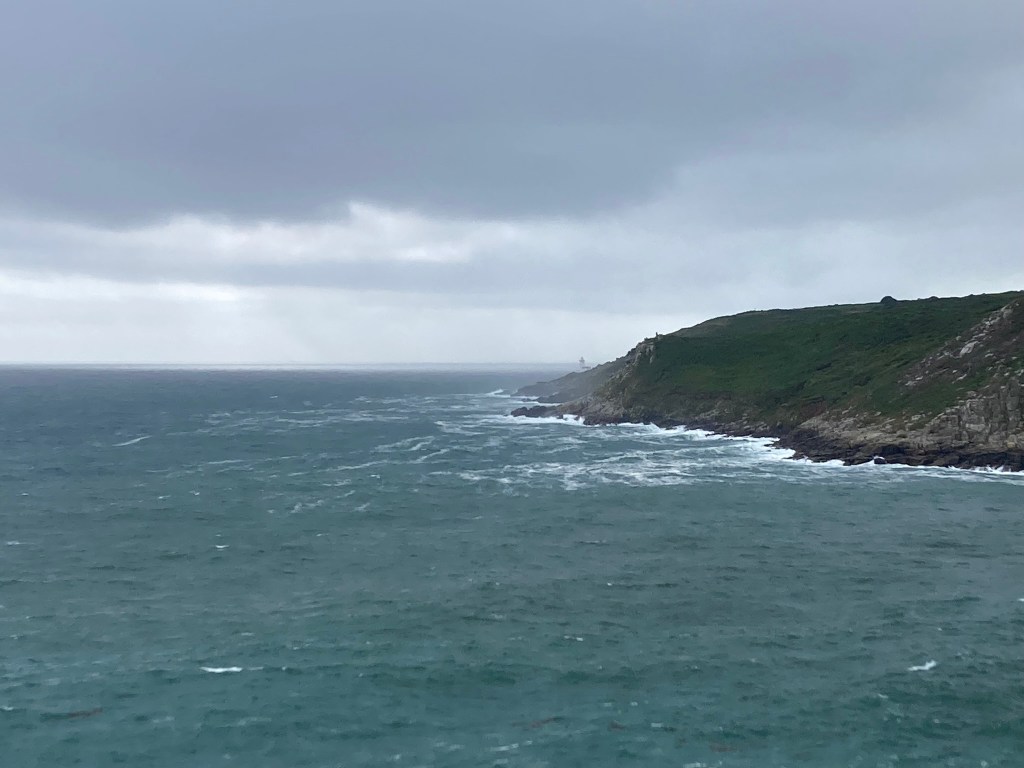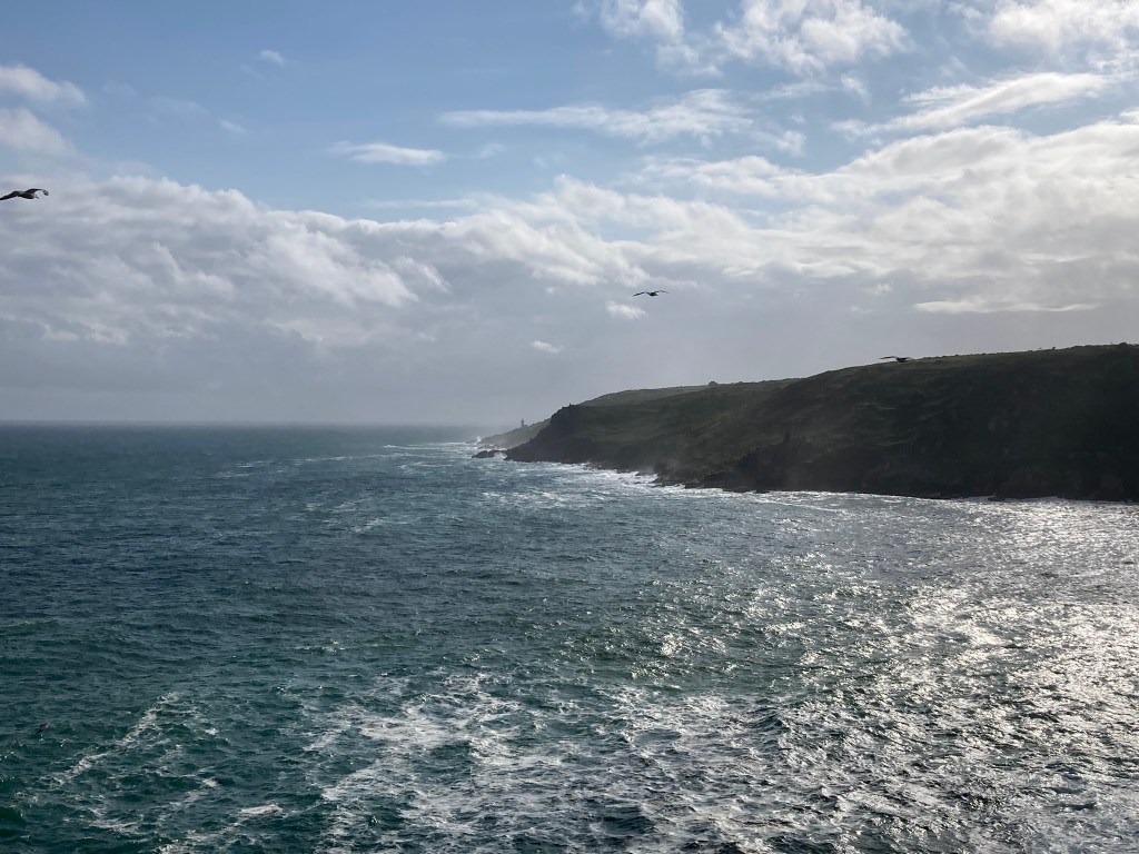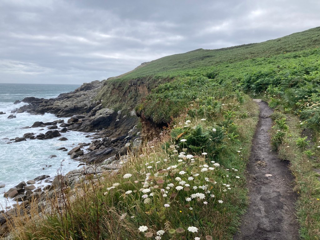 The next section does involve some overgrowth, but none of it holds a candle to the really bad muddy bit I just went through. The plants start to get smaller, and I can see way out into the ocean. There are more rocks, and then what I’d probably more accurately call cliffs, and massive white waves crashing against them, spraying into the air. I stand there in awe, watching the water gather into wave after wave, then come hurtling towards the shore and CRASH! Every time a good one rolls by, I can’t help but let out a cheer of “woo!” The energy propels me up the next hill, and at the top, I can see the Tater Du lighthouse far in the distance, and the break in the cliffs that leads to the little town of Lamorna Cove. The waves are thundering and the wind is pushing me around and I am just there, transfixed, a little moving bundle of energy on this huge, fathomless shore.
