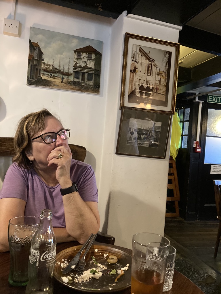 The Ship Inn, where we have dinner reservations, is packed when we arrive. We eventually work out where our table is, order, and marvel at the absolutely ridiculous coziness of this place. The ceiling is low and sloping, wide dark beams punctuated by white. The wooden walls are covered in paintings and photographs, none of them perfectly straight. There are lamps that cast golden light, and a band is getting ready to play. Picture a country pub in rural coastal England in your head, and the Ship Inn is what your imagination would naturally come up with.