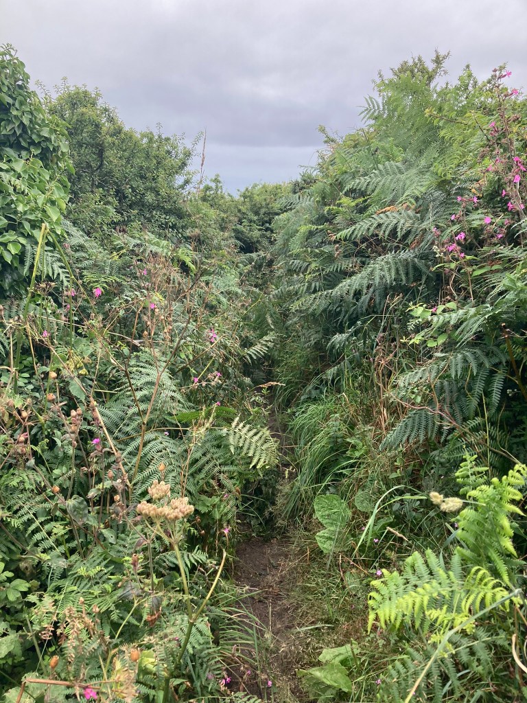 It’s not really just nettles, though, it’s overgrown ferns, blackberry bushes, and other varieties of pokey thing, often combined with mud, rocks, or steps with rebar that you can’t see. Every once in a while the trail will enter a wooded area and there will be a break in the overgrowth, or a viewpoint with a rock where you can step out of it for a minute, but for a while, it’s really just blindly walking through plants and hoping for the best.