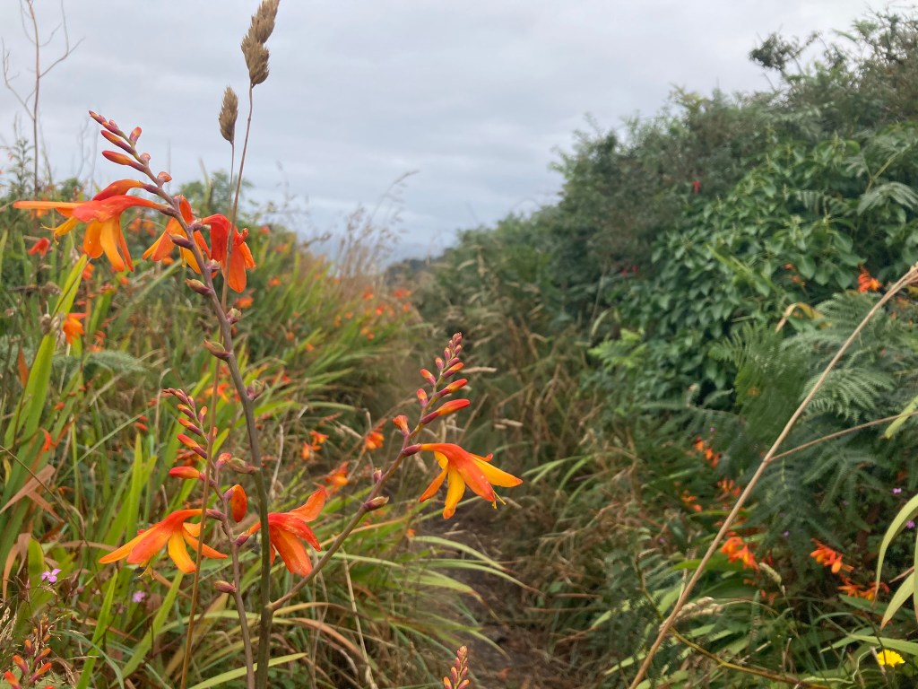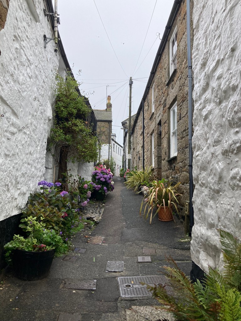 The trail first goes sharply up a hill that rises quickly out of town. Before long, I can turn around and see all of Mousehole and its harbor. The hedges are a riot of flowers and grasses on either side of the rapidly narrowing lane. Then the trail turns left, leaving the road, and enters a gravel track that soon becomes a wooded path. I pass a few other hikers coming the other way. Then I remember with a feeling of “duh” that I had a friend message me on Instagram saying that she’d just been to Mousehole and did a walk where she had to wear long pants and long sleeves because of all of the nettles. I look down at my very exposed legs—I can’t stand hiking in long pants and put my hiking skirt on by default—and brace myself for the sting.