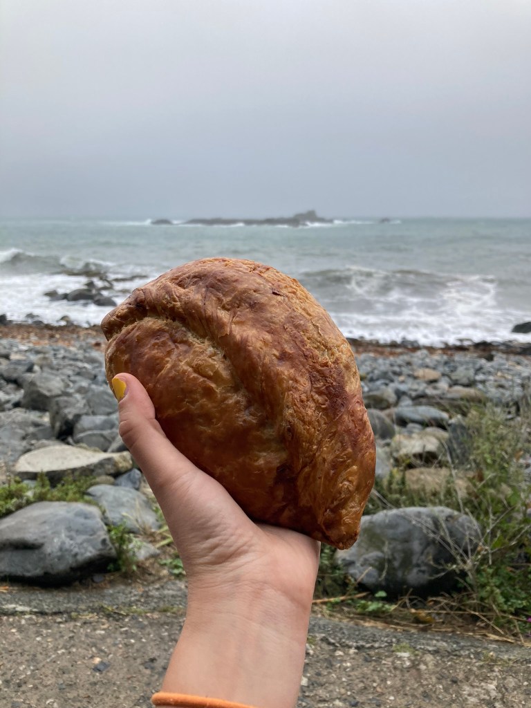 The rain eventually lets up a bit, transforming into a mist rather than a downpour, and we leave Dormouse in search of food. We wind up at the deli again, me in a semi-conscious and highly food-motivated state. Obviously, because this is Cornwall, I order an enormous Cornish pasty. Mom gets a sausage roll. We order it takeout and go to sit on a bench we saw last night facing the water. As we sit there nomming, several people pass walking their dogs. One woman looks at us and smiles. “Nothing like a pasty in a gale!” Another couple have to try very hard to get their dogs to keep moving once they smell our lunch. “No, that’s not your pasty.” Same energy, friendos. But this pasty is mine. I devour it. This is living. I wash it down with salt and vinegar crisps and a rose-flavored soda. Hi, yes, I’d like to formally report that if you need me, this is where I will be.
