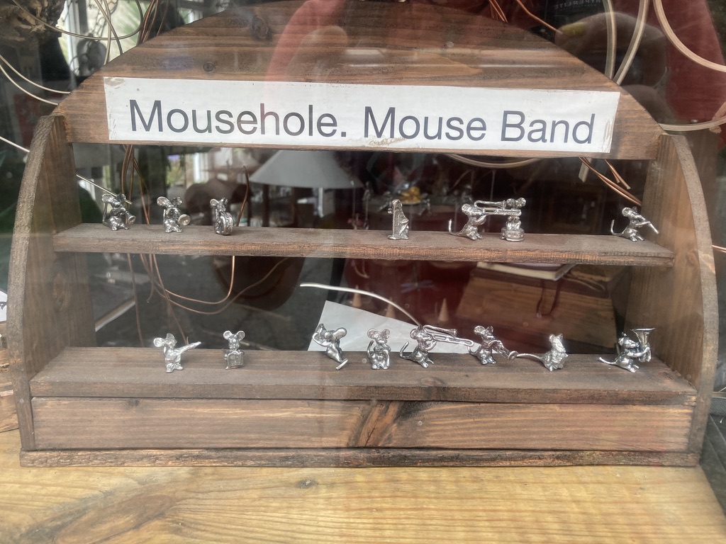 We return to a few shops and pop in some we didn’t see yesterday, including one I noticed on my hike but was closed at the time. It’s called the Ark, and it’s the workshop of a man named Paul. He handcrafts everything in the shop. Largely it’s pewter, but he says he also works with silver and copper. What caught our attention was the window filled with tiny pewter mice and cats, but the shop as a whole is a wonder. There’s a tree in the middle of the room with mushrooms all over it, and tiny handmade fairies hang from the branches. On one wall there’s a little model of a town with shops that have doors and windows, and the tiny pewter items that Paul makes are displayed in these little windows. He sees me looking and chuckles, “The shops are open, have a look in if you’d like.”