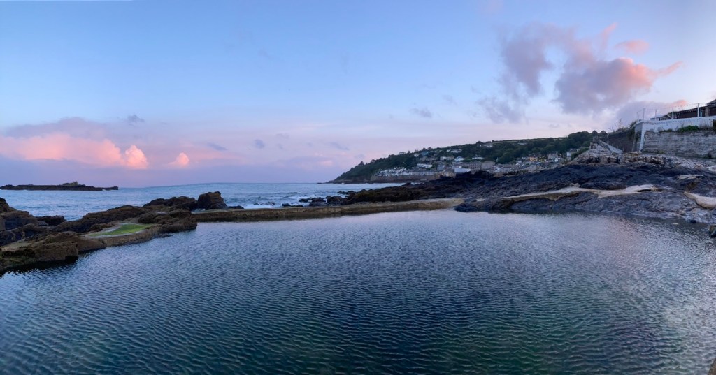 Where was I? Back to the walk. We pass the Penzance Promenade, then follow it as the city gives way to Newlyn again. Then up a hill, past the Red Lion, and along a road next to a thick hedgy tangle. At one point the pathway drops down to follow a paved section of the South West Coast Path in the woods, then the coastline opens up. The sun is setting and the water is calm, at least compared to yesterday. I look hard for seals again and find none. I take deep lungfuls of salty air as if trying to store them up.