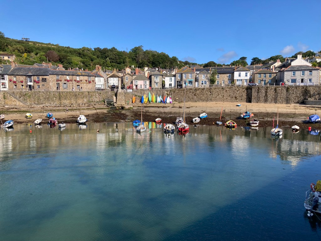 My alarm goes off and I set about making coffee and finishing up my packing. It’s the last day of the trip, and we have to leave Mousehole, which we very much do not want to do. We get everything packed and organized, and then I go out for one last quick walk around the town, walking out onto the breakwater and looking back at the village, the blue harbor, the boats, the Ship Inn, the clock tower. I love this place and the inexorable something of it. I feel like I’m being wrenched away.