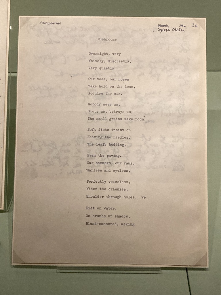 There’s something absolutely wild about seeing the rough draft of a great work, feeling a connection to the writer in the loops and squiggles of their idiosyncratic hand. One of my AP Lit students last year chose “Mushrooms” for her poetry analysis project, and I’ve been obsessed with that poem ever since. I take a photo so that I can share it with her later. Marveling. There are two copies of the Magna Carta, too, which is cool and all, but George Eliot? Sylvia Plath? Oscar Freaking Wilde? My English teacher brain is buzzing.