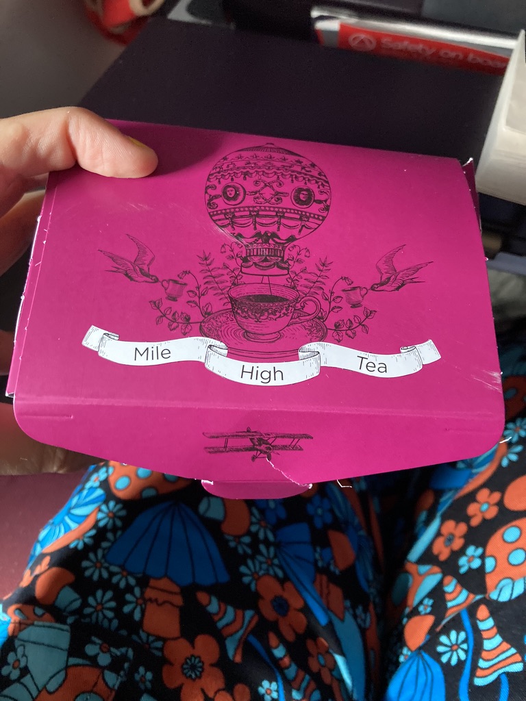 It is quite a nice flight, though. I start reading The Woman in Black by Susan Hill, one of the books I got in the airport, but don’t get very far. I write, I sleep, I listen to music. I feel like most people would be watching the large selection of movies, but I am not really a movie person and I don’t feel like it. They serve us lunch, and a snack, and coffee at last, and, later on as we’re almost landing, a little box labeled “Mile High Tea.” Precious! Inside is a scone, a tiny container of Cornish clotted cream, and a tube of jam. One last cream tea.