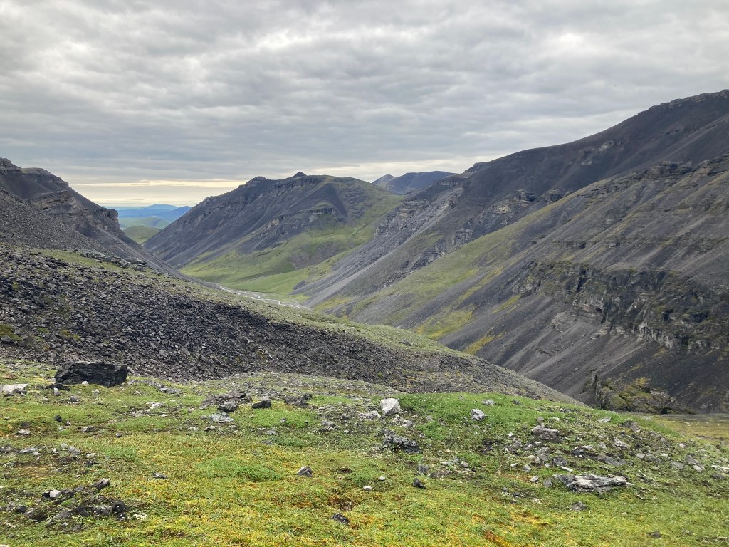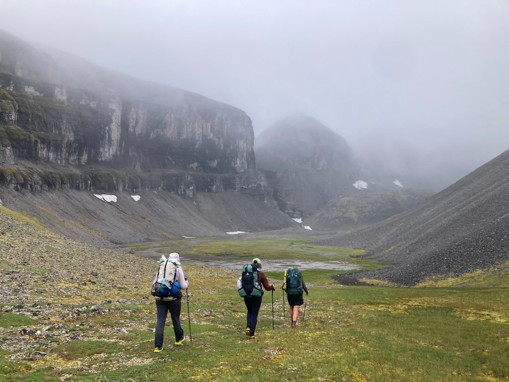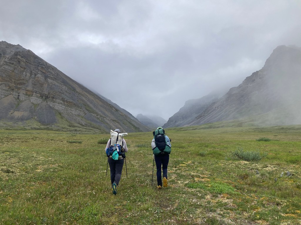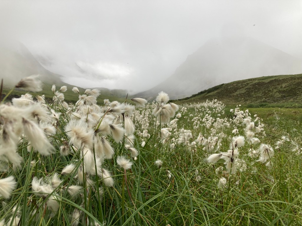 Chelsea waits for me as I pack up, then we go to meet Carrot and Gahl at the creek. Carrot lets me use the SteriPen again (another reminder of the feeling that I’ve royally fucked up my preparation for this trip) and then we’re off. It is really beautiful for the first part of the day. We follow this river valley along the faint remains of the ATV track as far as they go, then pick up another to go into our next drainage. There is willow, historically the only firewood available to the Nunamiut, and then there is fluffy cottongrass swaying in the wind. It looks like something from Dr. Seuss. We all crouch down to take photos of it.