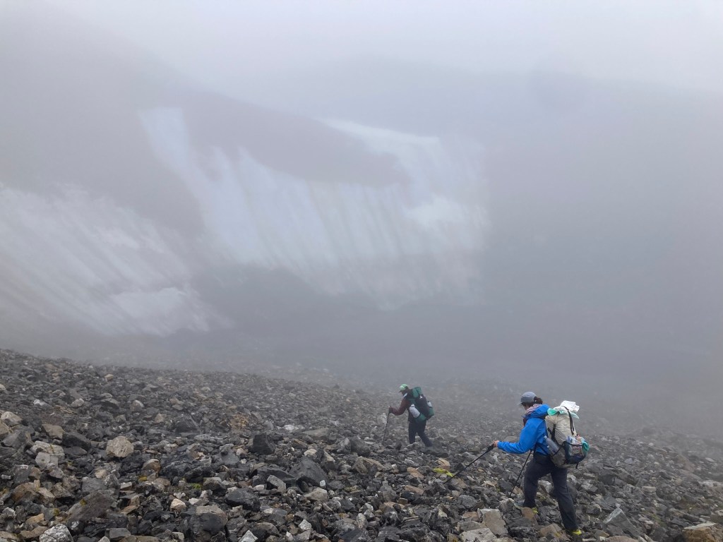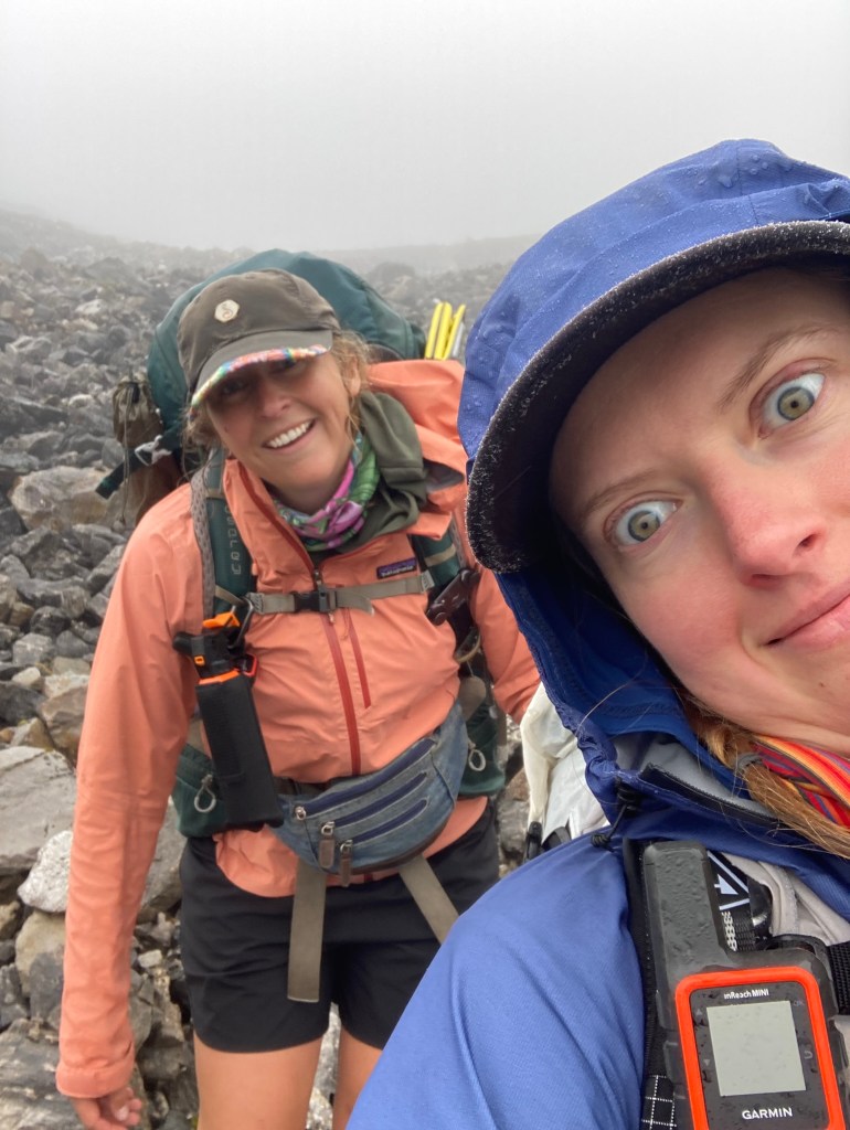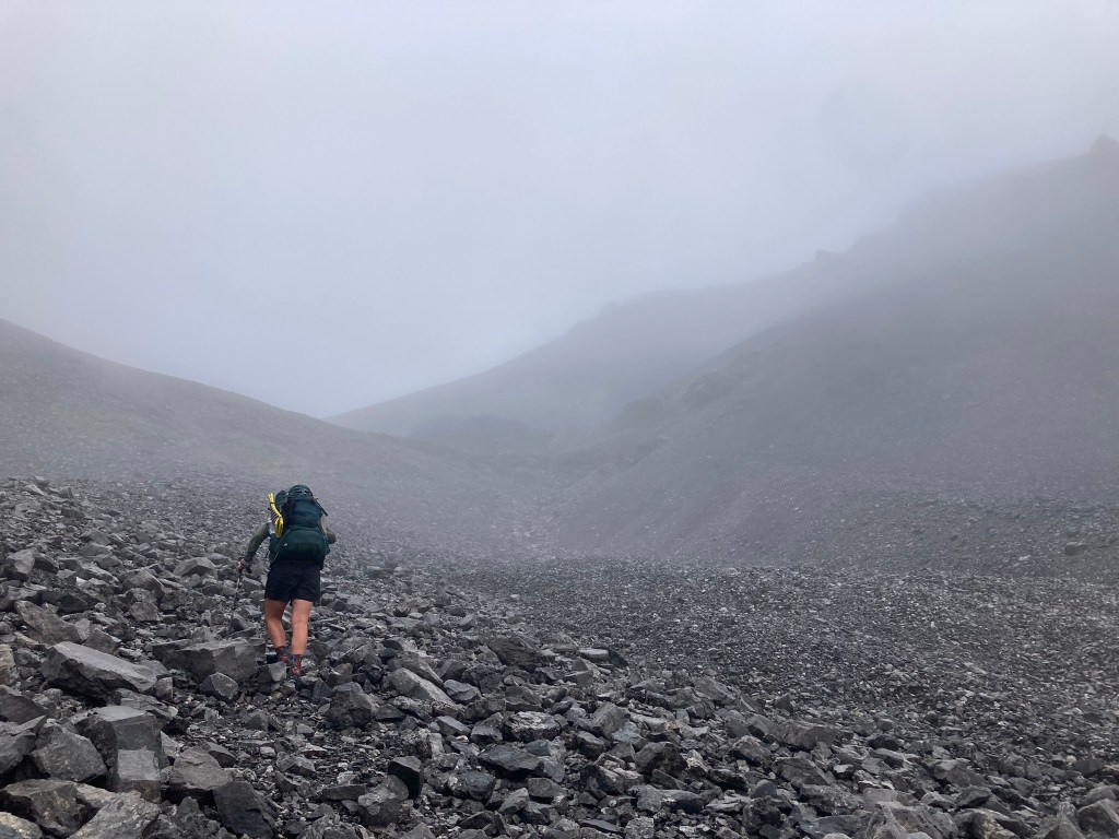 We keep picking our way through the terrible moonscape, Carrot and Gahl ahead and Chelsea and me following. It’s getting pretty cold now, and still misting. Gahl asks if we want to stop and put rain pants on, but I’m already so wet and I keep thinking that we’ll arrive soon, so it doesn’t seem worth it.