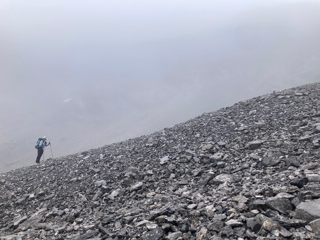 We descend to a mystical bog valley with towering walls. Then there is a steep climb on scree. It’s actually pretty fun at first. There are enough good places to put your feet that you can get into a kind of rhythm. We’re all laughing and joking and generally having a good time.