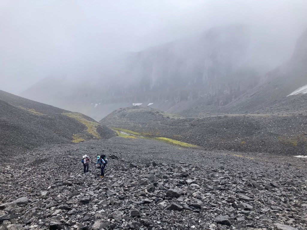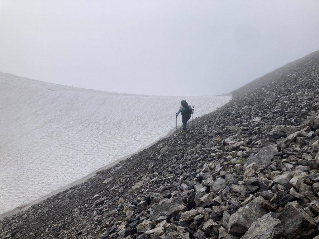 The hill takes a turn to the left and we see a giant snow patch. It seems to get even more giant as we go up. It’s ice and snow, it’s not on the map, and it’s very steep. We stay to the right of it on the scree, but the problem is that the steeper the incline gets, the less stable the rock becomes. Every step sends you sliding down, not quickly or in a way that feels life threatening, but scary enough to make you freeze. I head up after Carrot and then cling to the rocks. Gahl and Chelsea follow, neither of them loving the loose rocks either. I guess my lunch really worked wonders because I get a little more confident the higher we get. I realize that if I walk right next to the snow, the rocks can’t go anywhere so they don’t slide. It’s precarious because one step on the ice could send me sliding down, but it’s a lot faster, and I just rely on adrenaline to rocket me up. Then I’m at the top away from the snow.
