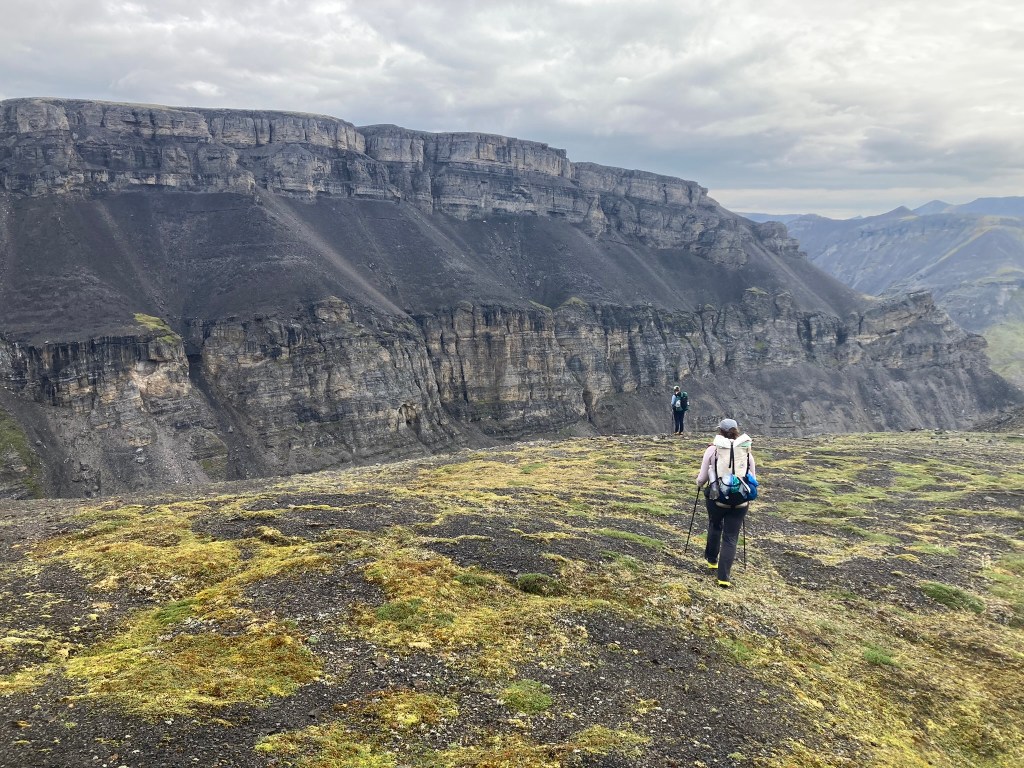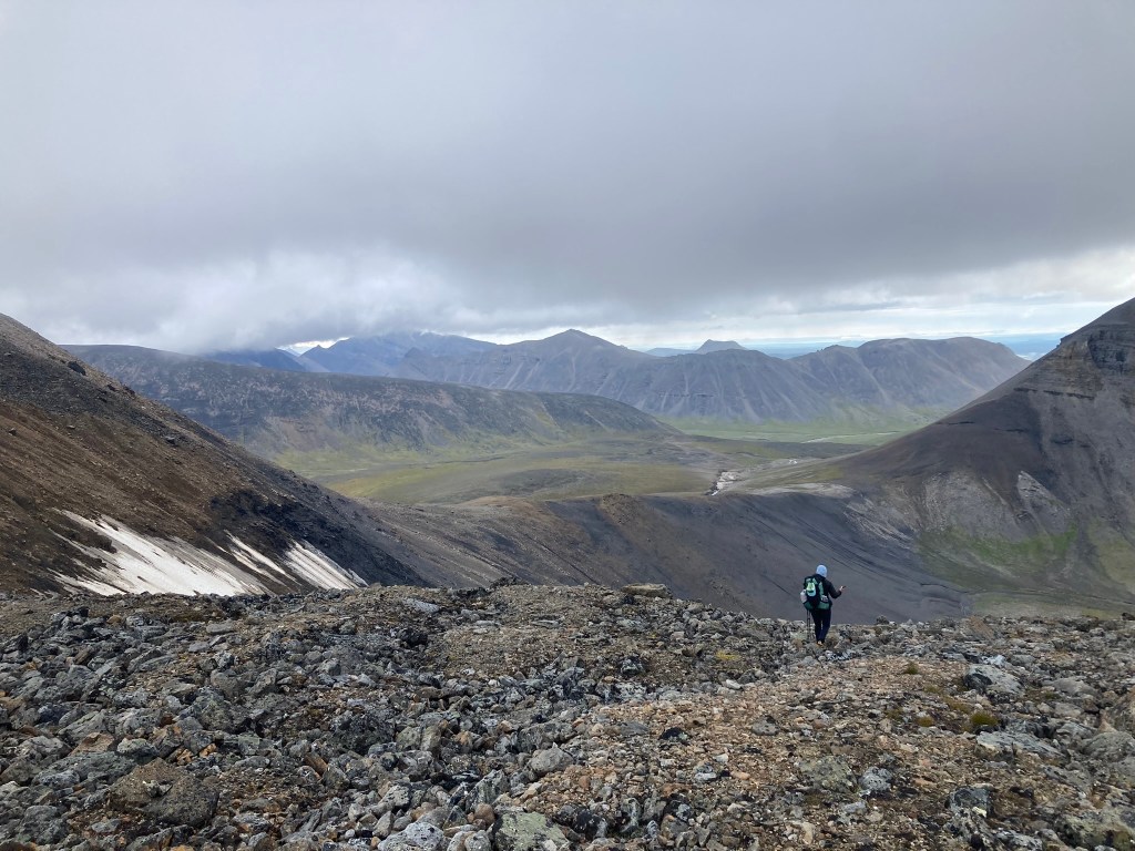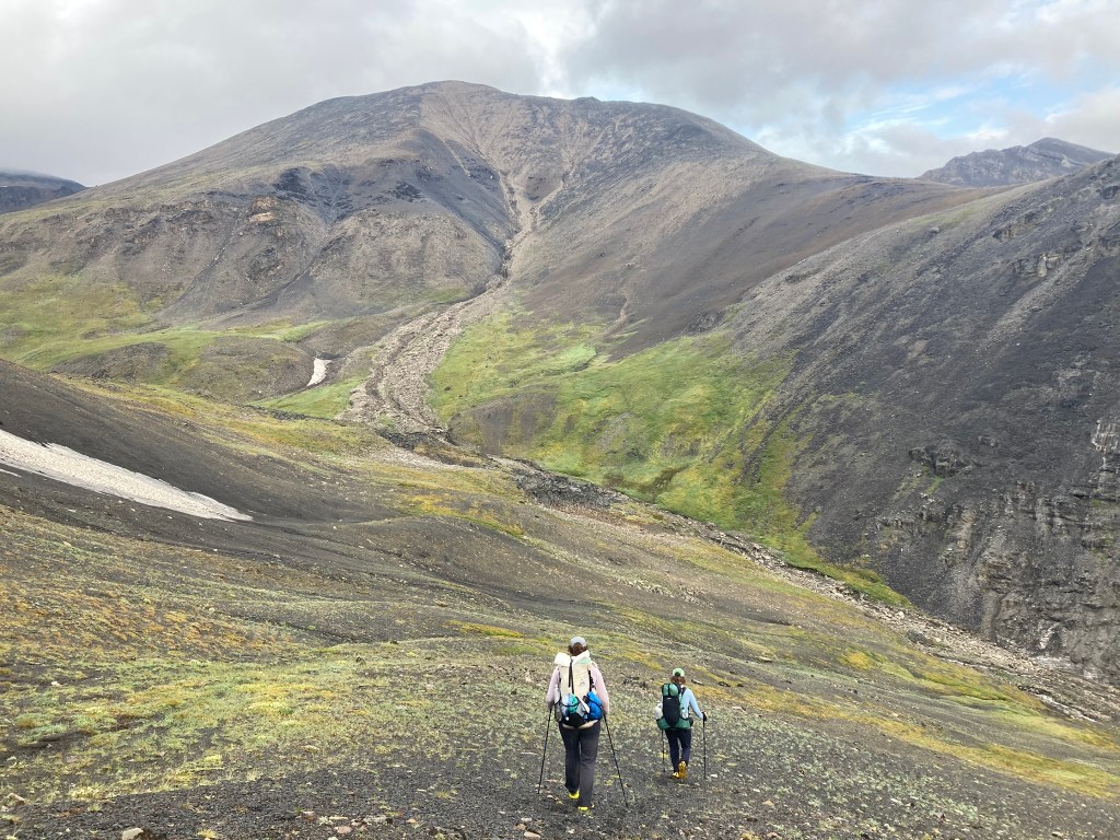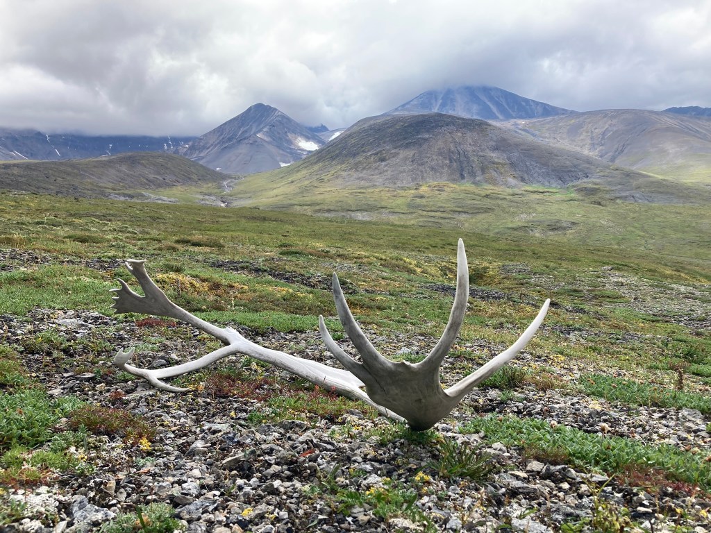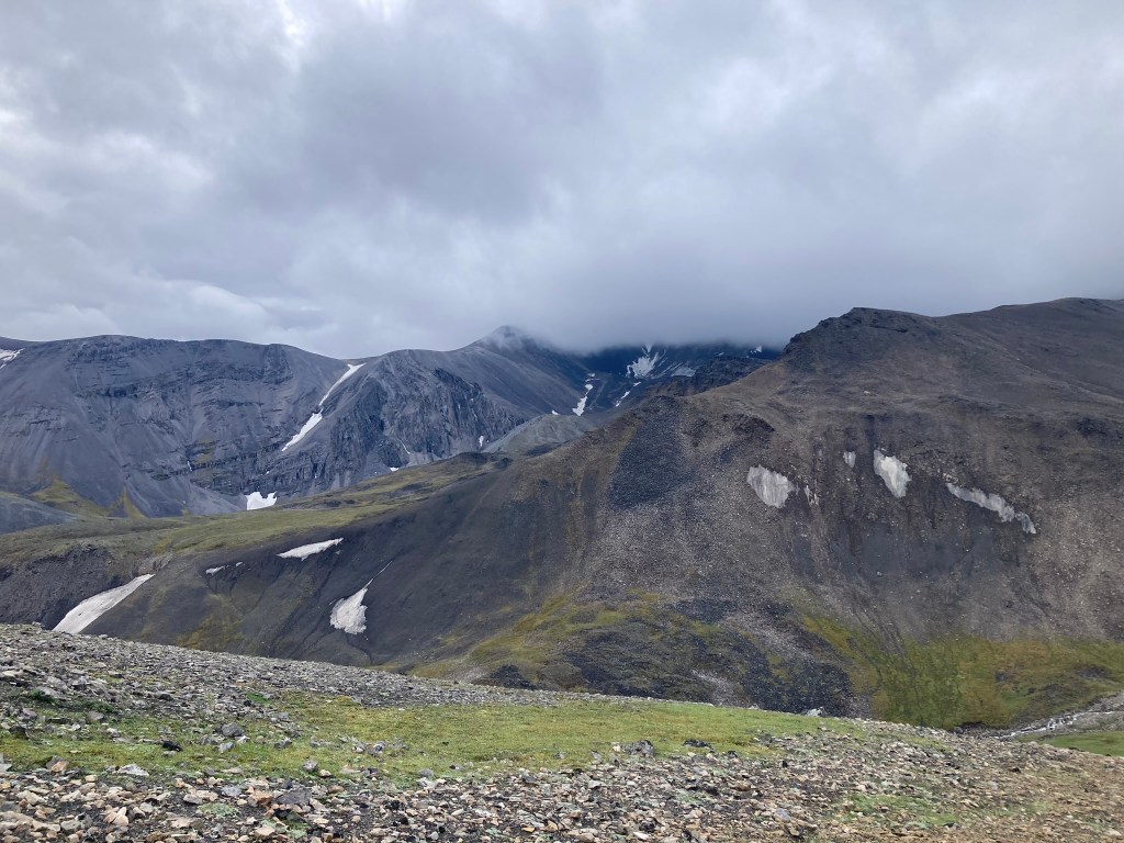 We have another short climb after lunch, but it’s not too bad and it puts us in this smooth, beautiful world of sloping mountainsides strewn with lichen, loss, and grass. In the distance we can see the lake we were aiming for yesterday and yeah, there is no world in which we could have made it there. On this green side of the slope the walking is so chill. I think after yesterday we’re all nervous about terrain, but this is magisterial. You can just walk. What a revelation! No scrambling or struggling, just walking forward. And the sun comes out again! It illuminates a caribou shed so that it shimmers in the light.