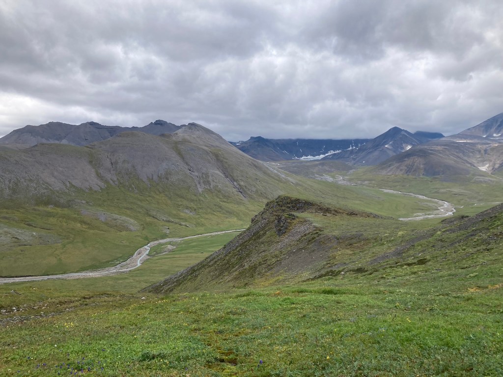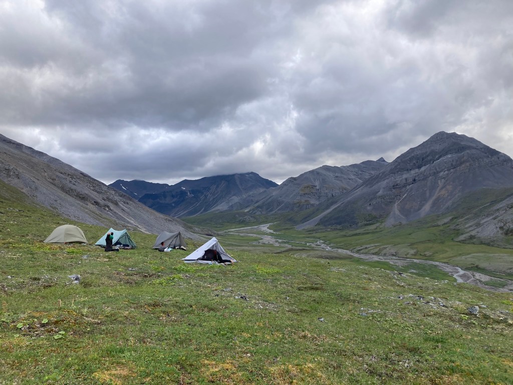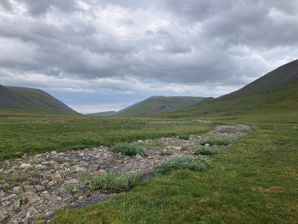 At the top of said short hill we can see the goal we’ve been working towards: a huge green valley with a meandering braided river cutting through it. We take a look at the land and try to decide where to head for camp. We spot a flat-looking place down to the right. It turns out to be so lovely, the softest hug of a tundra. We go to get water in the stream and then set up our tents.