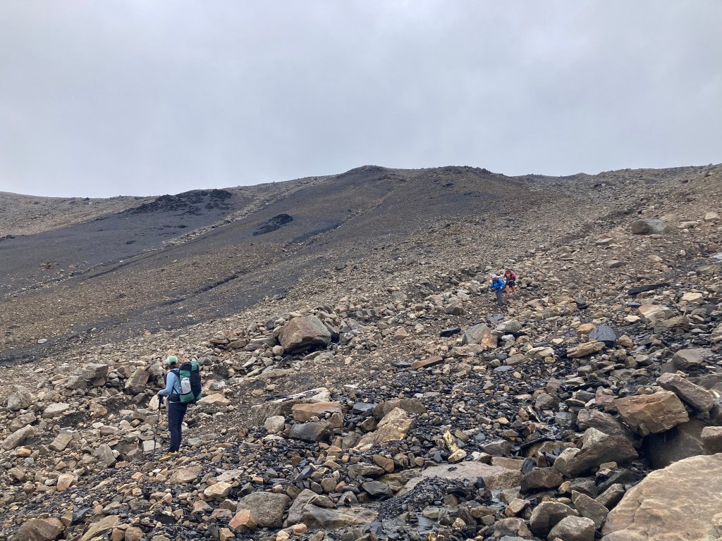 We continue up, the steep bit leveling out a little and the climb continuing until we reach a nice ridge. It is rocky, but the steps are small and manageable. The mist is rolling around us, but we can still see. It’s magnificent up here. The surrounding peaks, the movement of clouds, the green valleys in the distance. We walk across the ridge and follow it as it descends, meeting back up with our track and spitting us out into this little bowl with an small glacier off to our left.