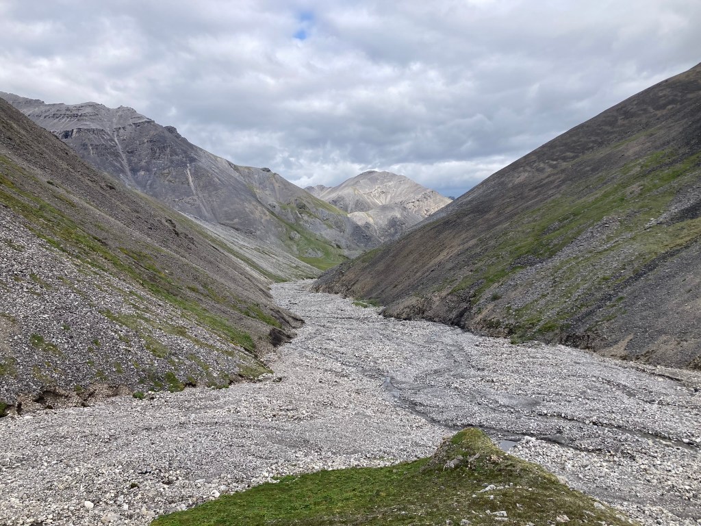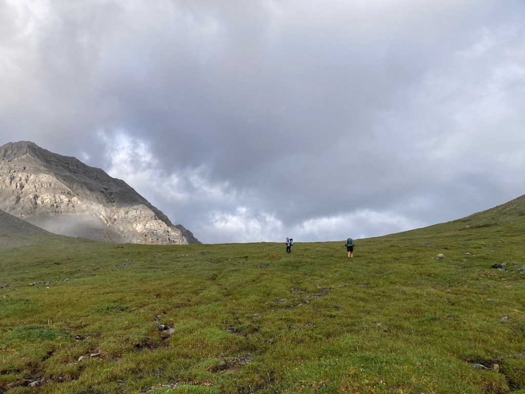 We walk downhill towards the huge bog at the floor of this valley around the creek. It is very, very boggy. Hello. Good morning. Squish. We cross a pretty powerful and very cold river and I get the screamin’ barfies but don’t dwell on it. On the other side we skirt around the bog as best we can by sticking to the edges of rocky “islands” in the bog. We then wind up at the “grassy ramp” we had been looking at from camp. It looks decidedly less chill from here.