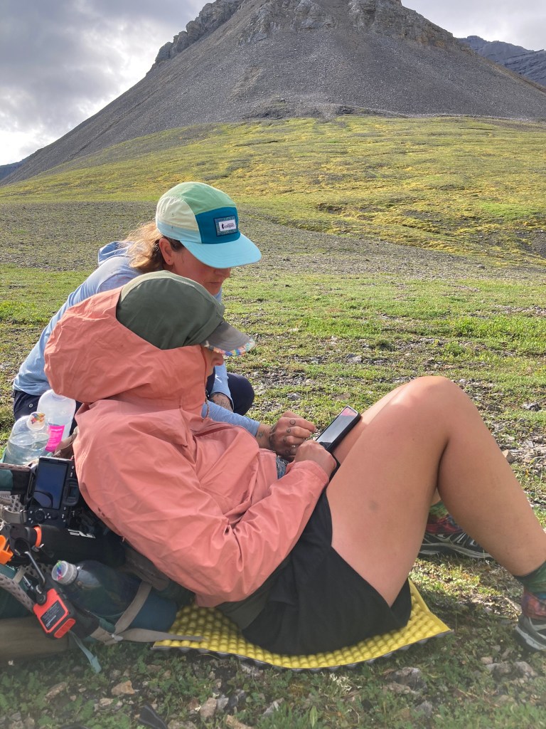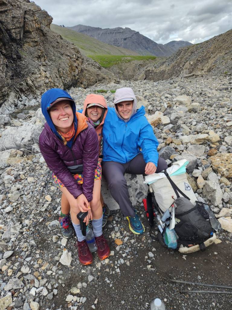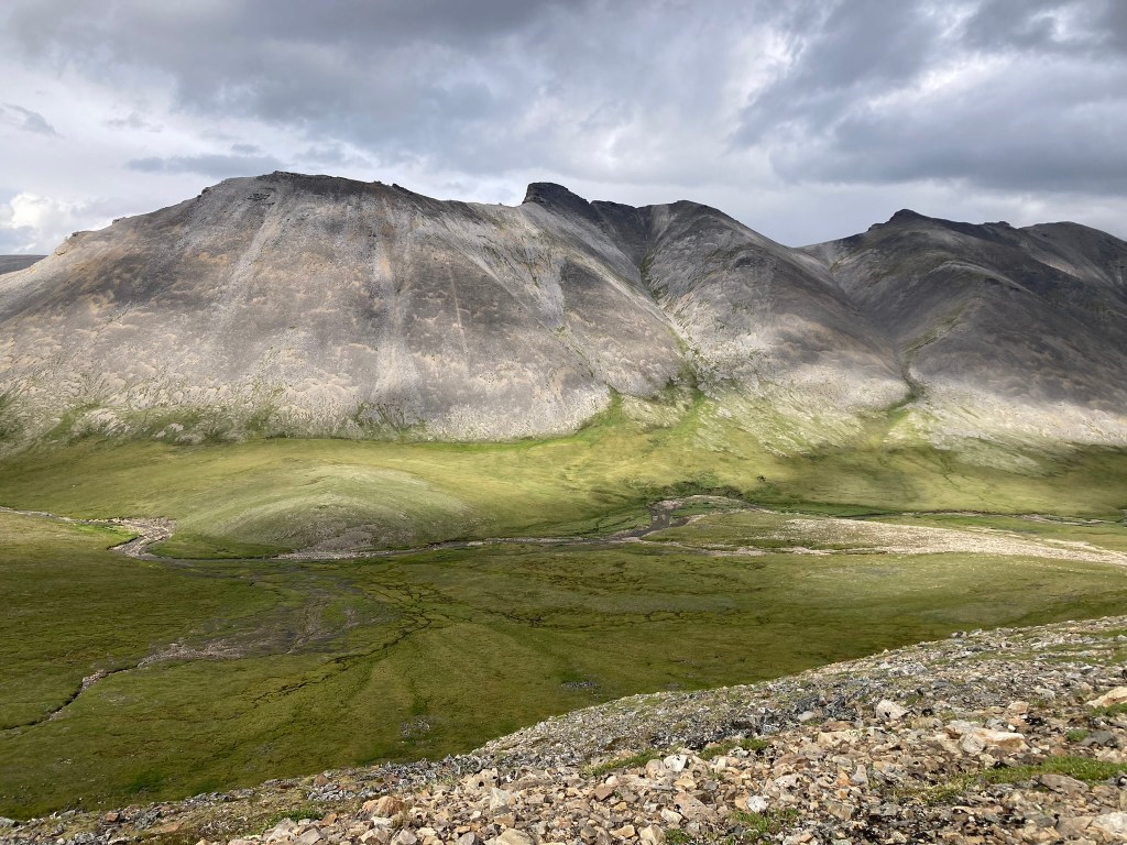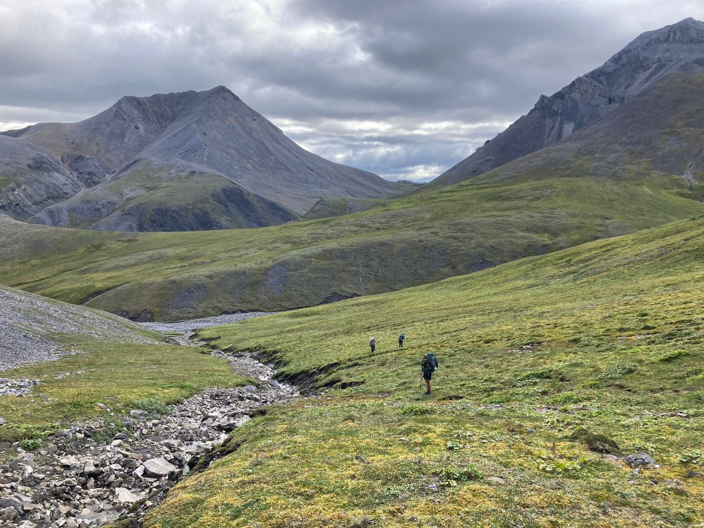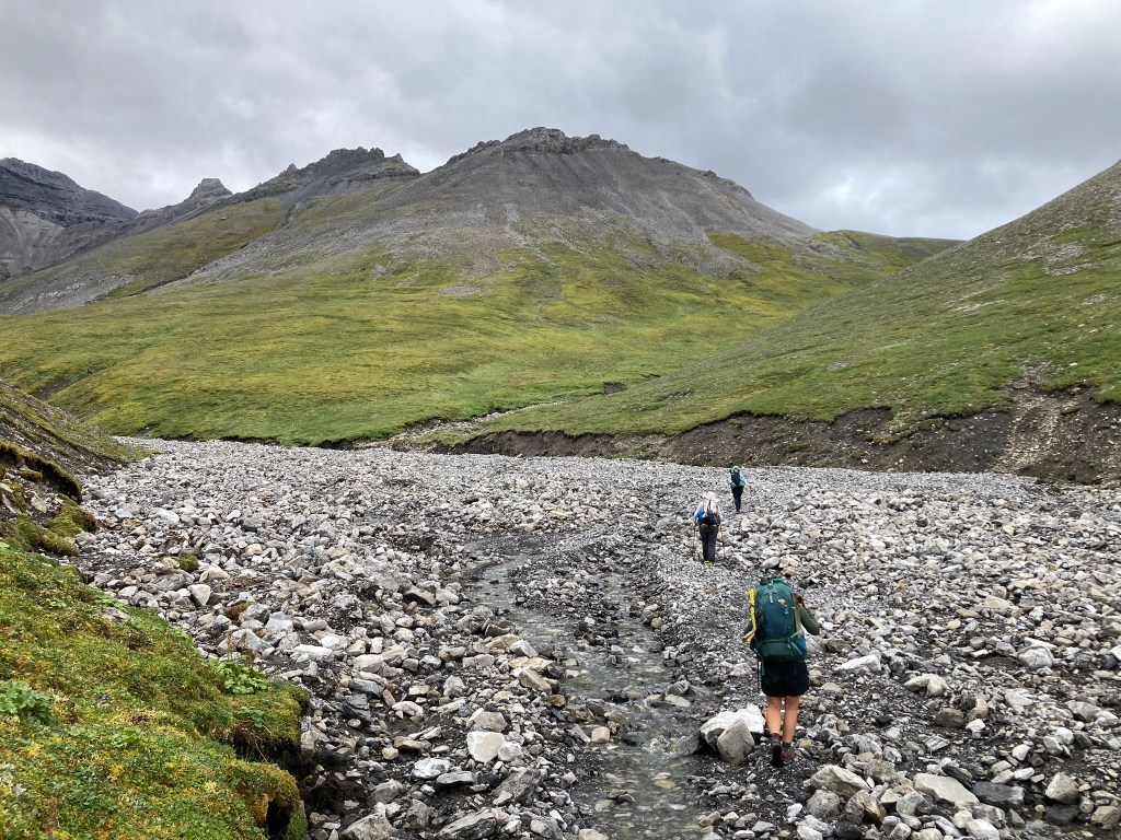 We head down from the saddle and take a quick break to check the map. Carrot proposes a bail option that deviates from our original route on CalTopo because this “uppy downy stuff” is not it and we are not covering the kinds of distances we need to be in order to finish our loop and make it back to Anaktuvuk Pass without having to ration food. Something we’re all learning is that even if something is marked white—meaning pretty chill and not too steep—on the USGS topo map we’re using, it is often still very not chill. Our goal is to follow this creek down, curve around the toe of a peak, and then dip down into another drainage to hopefully wind up on kinder terrain.