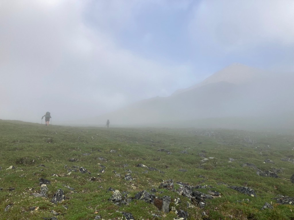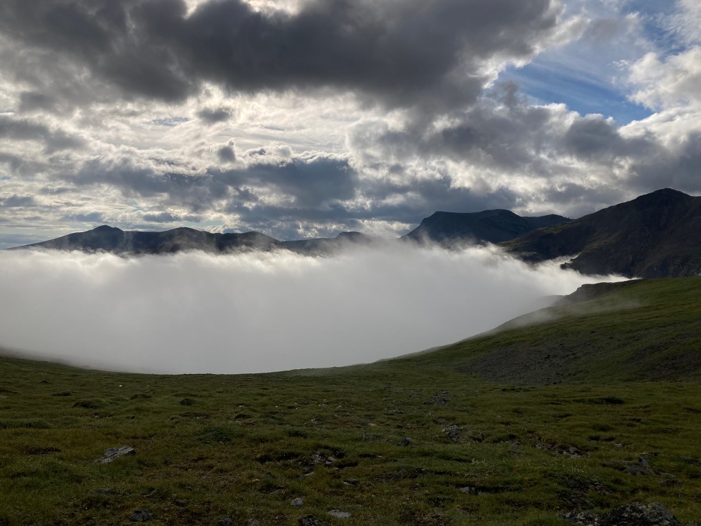 It is very steep because of course it is. Not as bad as some of the ascents we’ve done but not chill either. I’m so winded and over it by the time I reach the top that it takes me a second to register the view behind me when I turn around. We’ve just climbed out of the mist and are now in the sunlight! Everything is glittering. There’s a glacier in the distance. The mountains look very dramatic against the mixture of blue sky and swirling clouds. Worth it.