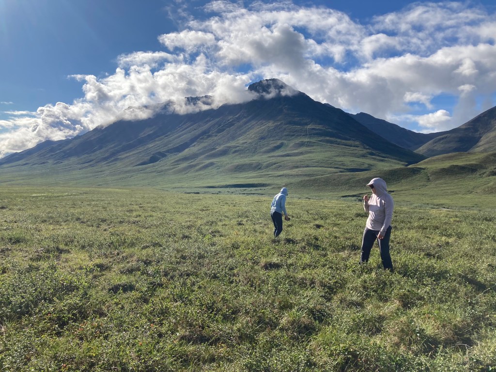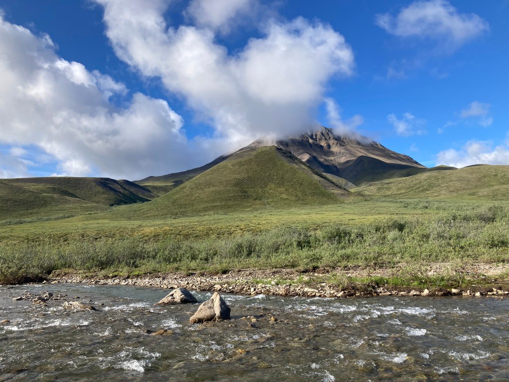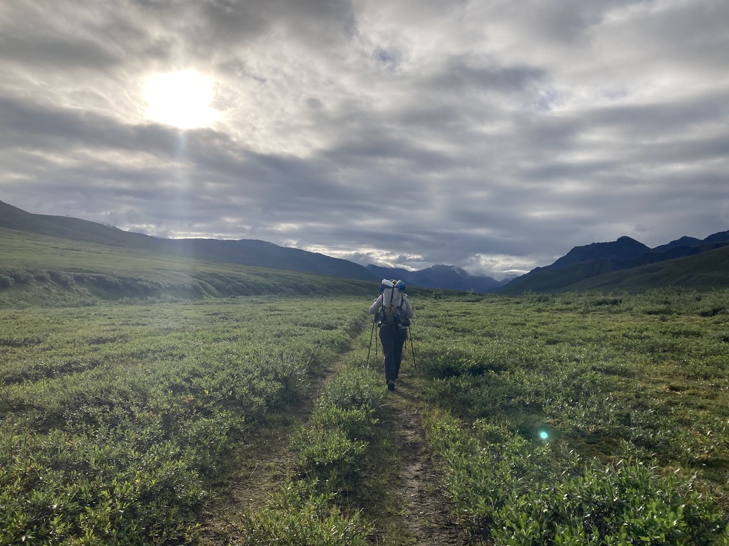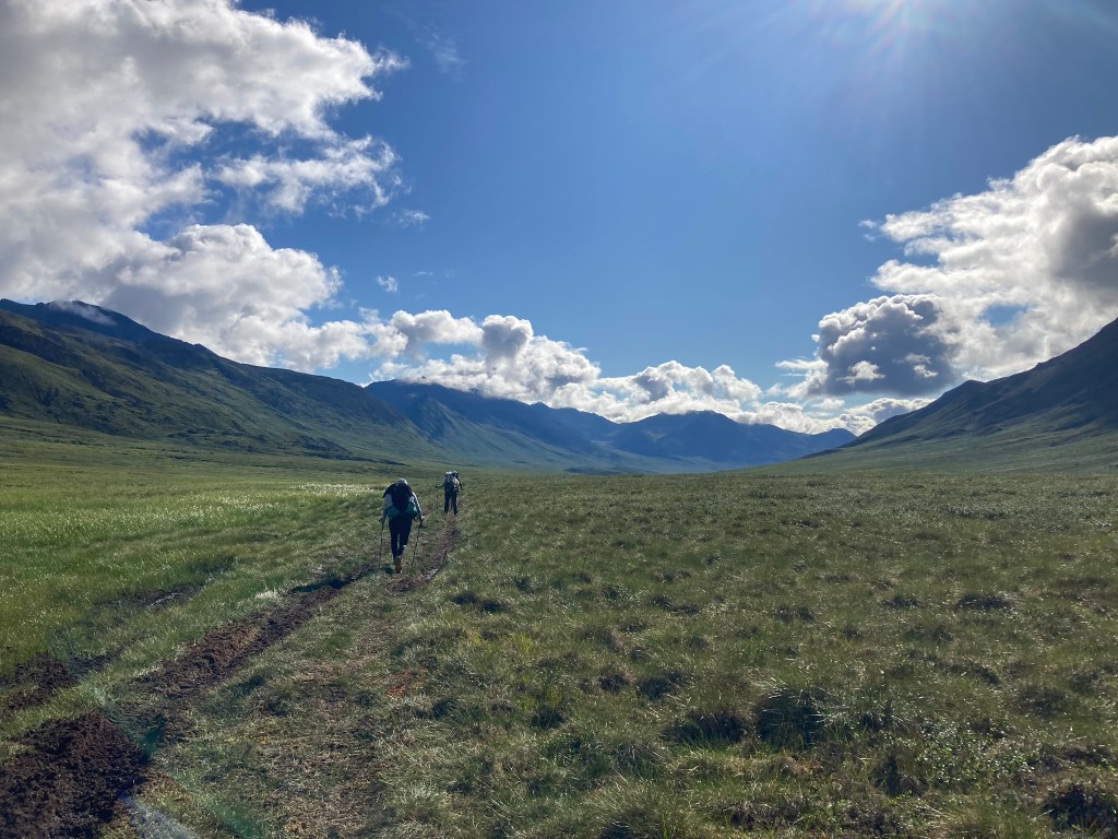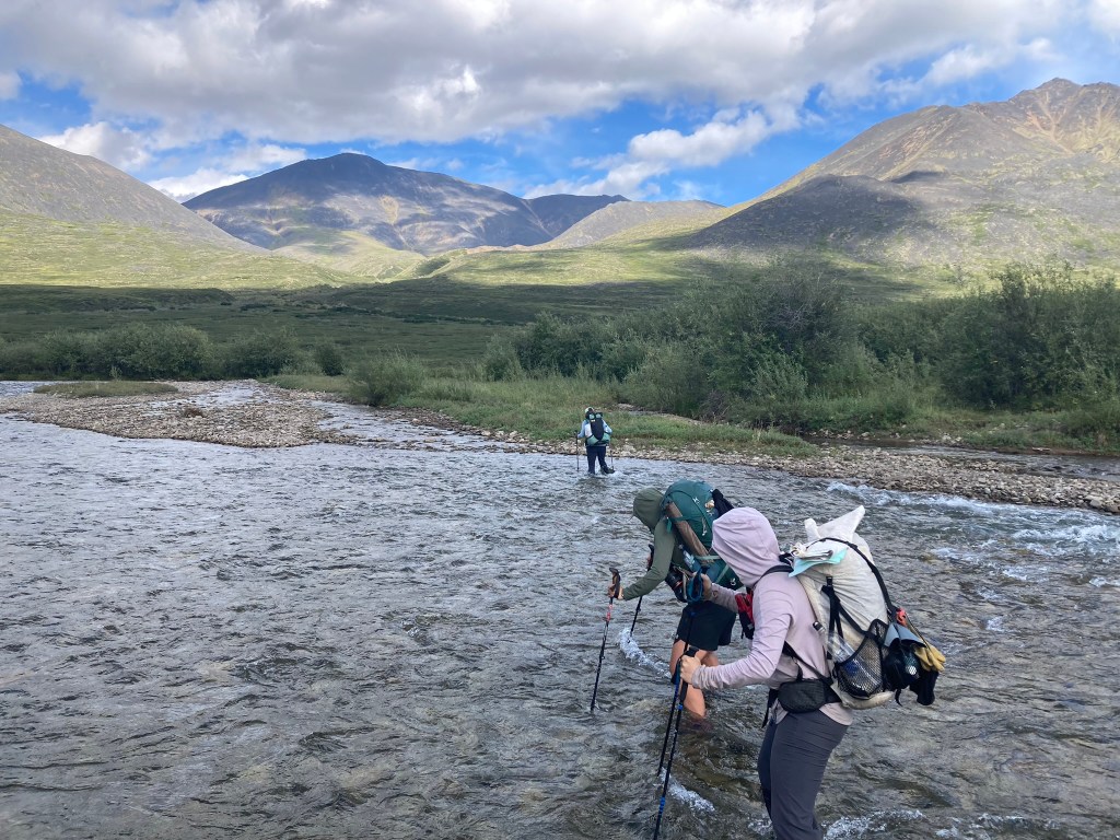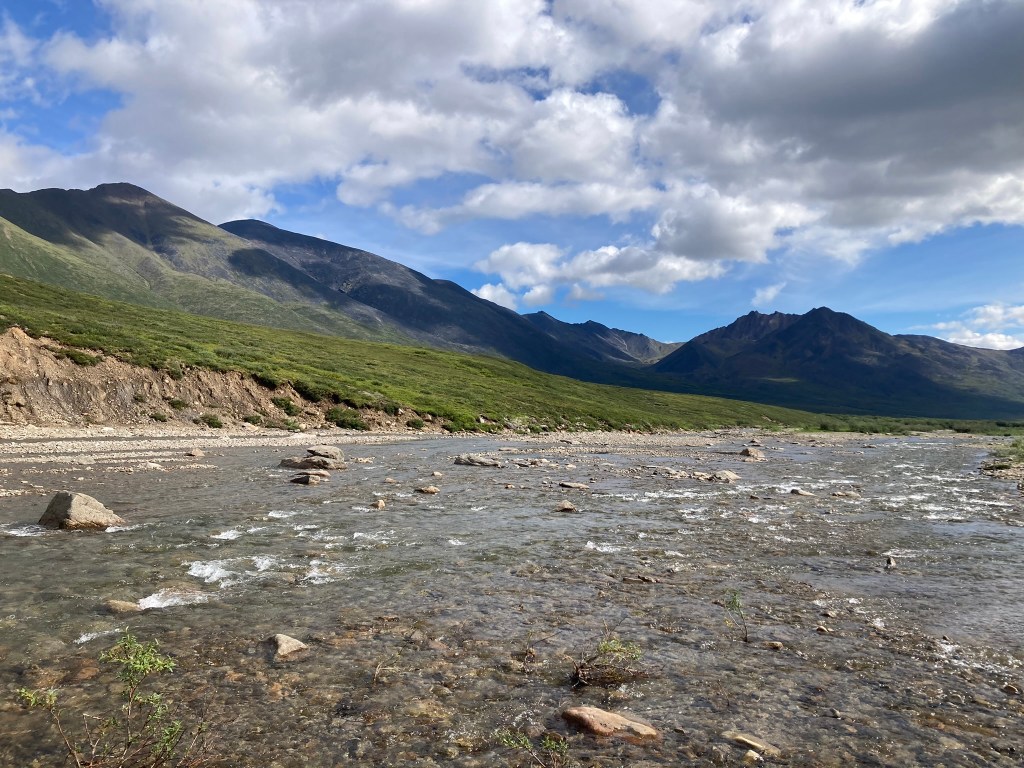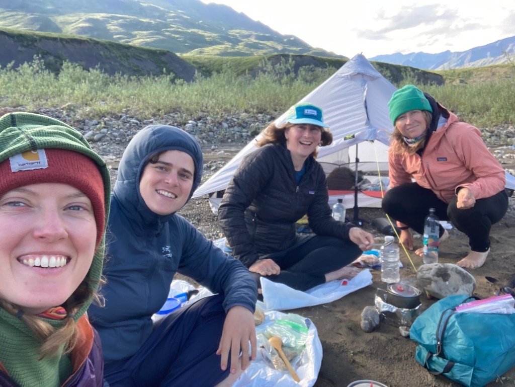It’s a struggle to set up camp because it gets really windy, but big rocks do the trick. We all cook dinner together. Gahl initiates a sharing of “roses, thorns, and buds” for the day: a good part that stood out, a tough moment, and a hope for the next day. My rose is the cloudberries. My thorn is my post-lunch blahs. My bud is that there is pizza in the store in Anaktuvuk tomorrow—we’re planning to make it there around midday, camp, and have a chill overnight the next day. After bailing on our high route and choosing the boggy valley instead, our pace has really sped up.