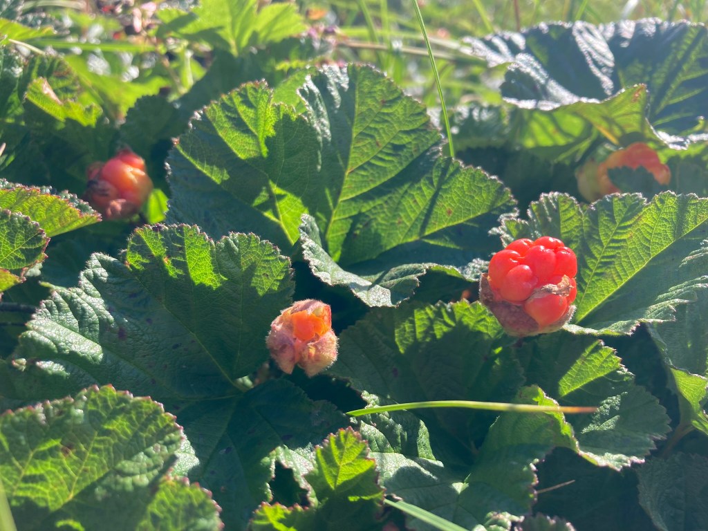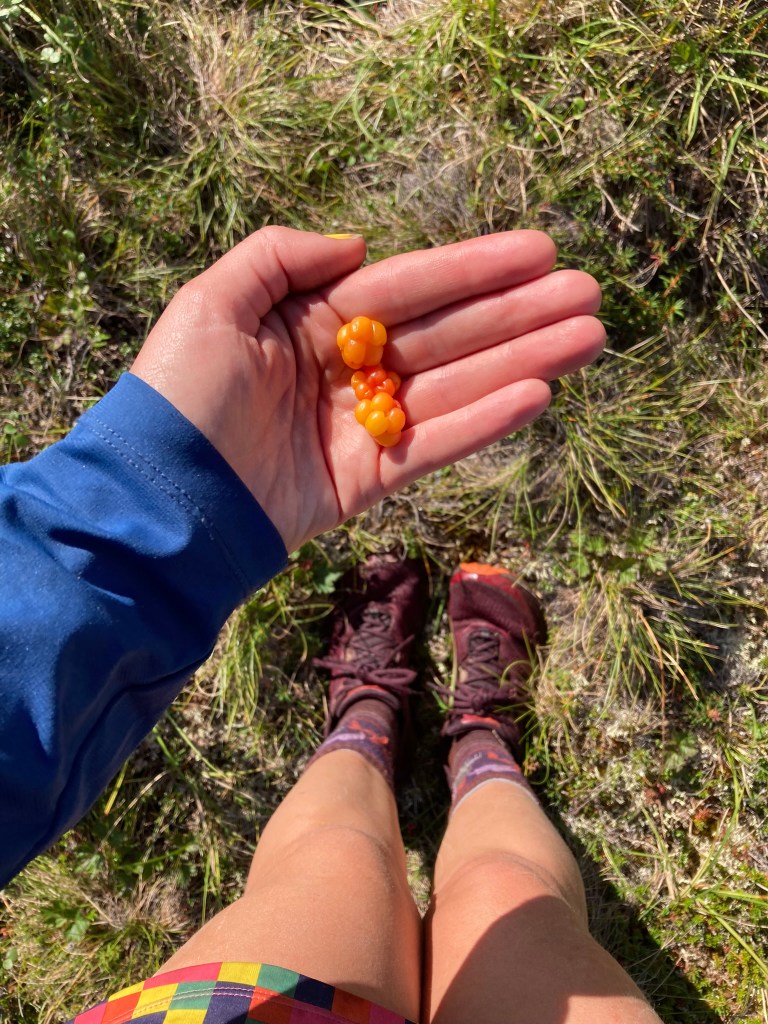 We come upon a patch of berries that Carrot has told us are called cloudberries. Unripe, they’re a sort of gentle pink color not unlike that of raw salmon flesh, and ripe, they are a pastel yellow. They sort of look like engorged raspberries, and they grow upwards into the air as if offering themselves. We plop our packs down and spend some time in the cloudberry patch. The taste is something like applesauce, but maybe also a bit peachy. But the texture is mealy, thicker than the juice of a raspberry. This is only something you can experience here, in the bog of this region. It feels like a religious experience to eat the berries beneath the mountains and a clear blue sky.