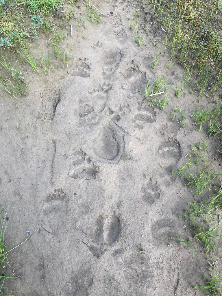 I have to stop suddenly for a cathole (cloudberries, probably), and after that I meet back up with the other three, who point out three sets of tracks in the mud: moose, wolf, and bear, all together. They’ve each added their footprint next to the animal tracks, so I do too. All sorts of animals out here!