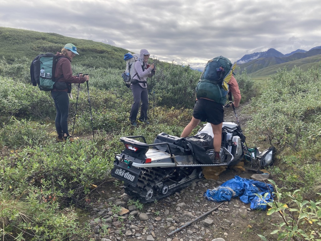 After lunch I sort of enter a fog, even though I had a coffee and electrolytes. We bushwhack through some willow, lose the trail, cross the creek a bunch, then navigate more willow. We find some teeth that we think might belong to a moose. Actually, we’ve seen lots of tracks today—moose, but also bear and what we think might be wolf.