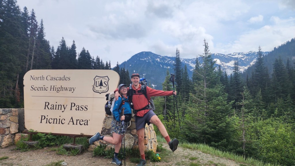 “There it is!” Rob announces as we arrive at the Rainy Pass sign. He parks the car and we rearrange our items into useful configurations. Andy doesn’t have extra ziplocks so he just shoves his couscous and Kraft Mac and cheese into his bag like an amateur. About three whole minutes go by and then he’s ready to go. I’ve just opened a bug wipe and have to pee again. Kidding me? I guess it’s past time for me just to accept that I’m chaos incarnate and Andy is an efficient robot.