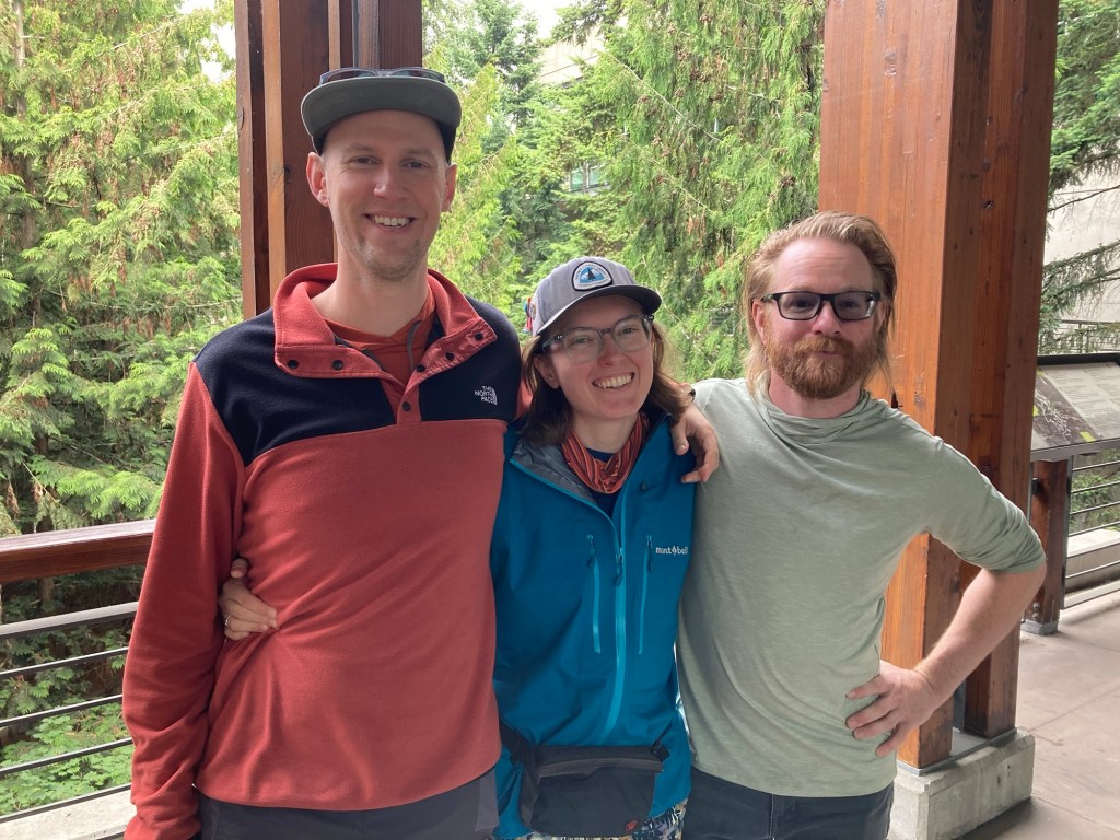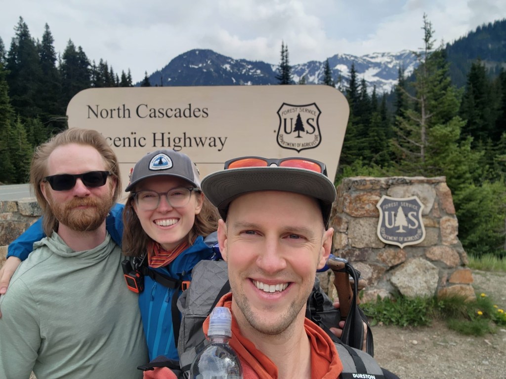 For about half a second I’m thinking, “Why is this random man talking to me?” And then the identity of said random man clicks and I’m squeezing him and squealing uncontrollably. Rob, aka Tribute, who lives in Tacoma, agreed to drive Andy and me to the trail today, and here he is making his standard casual entrance. He looks basically the same, though with a shorter beard and longer hair. Time collapses in on itself again. We chat, beginning our manic multi-hour catch-up, as I try to decide which headlamp to buy (settled on a rechargeable Black Diamond, as a treat). After my manic run through the maze of the store to a restroom, I meet the guys outside. Mark takes a photo of the three of us. 2022 calling. Its hikers have returned.