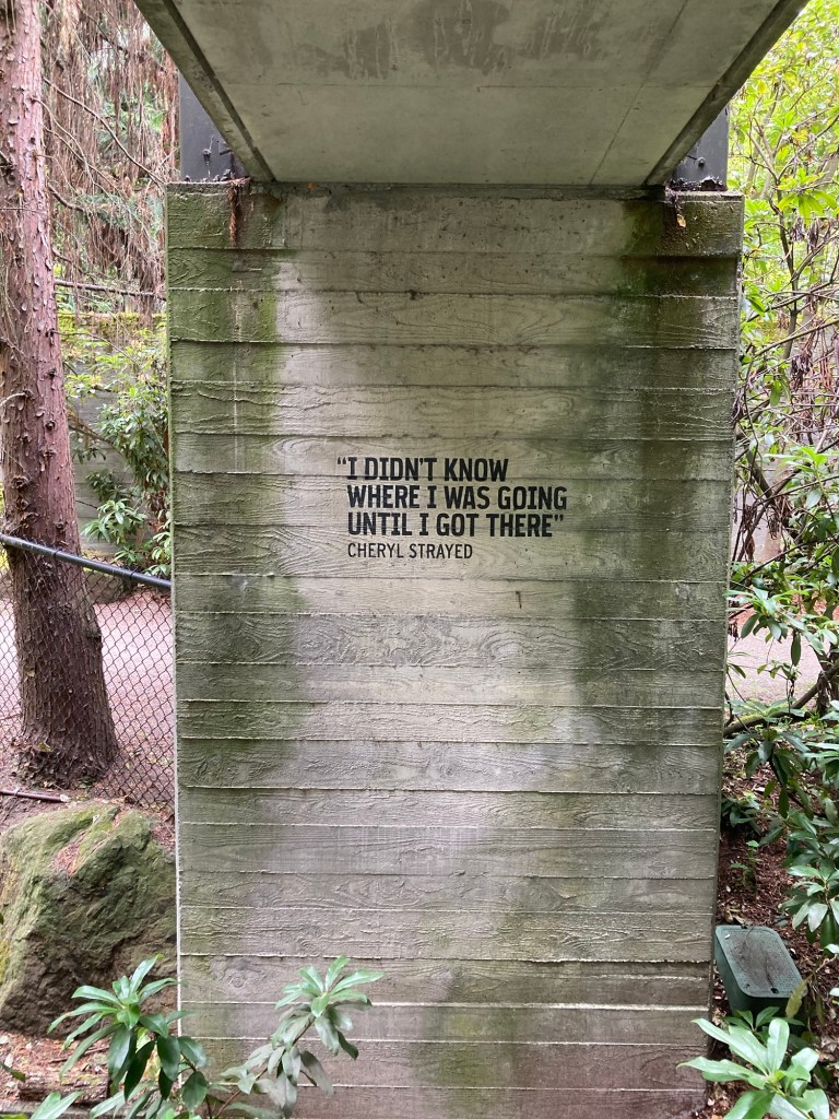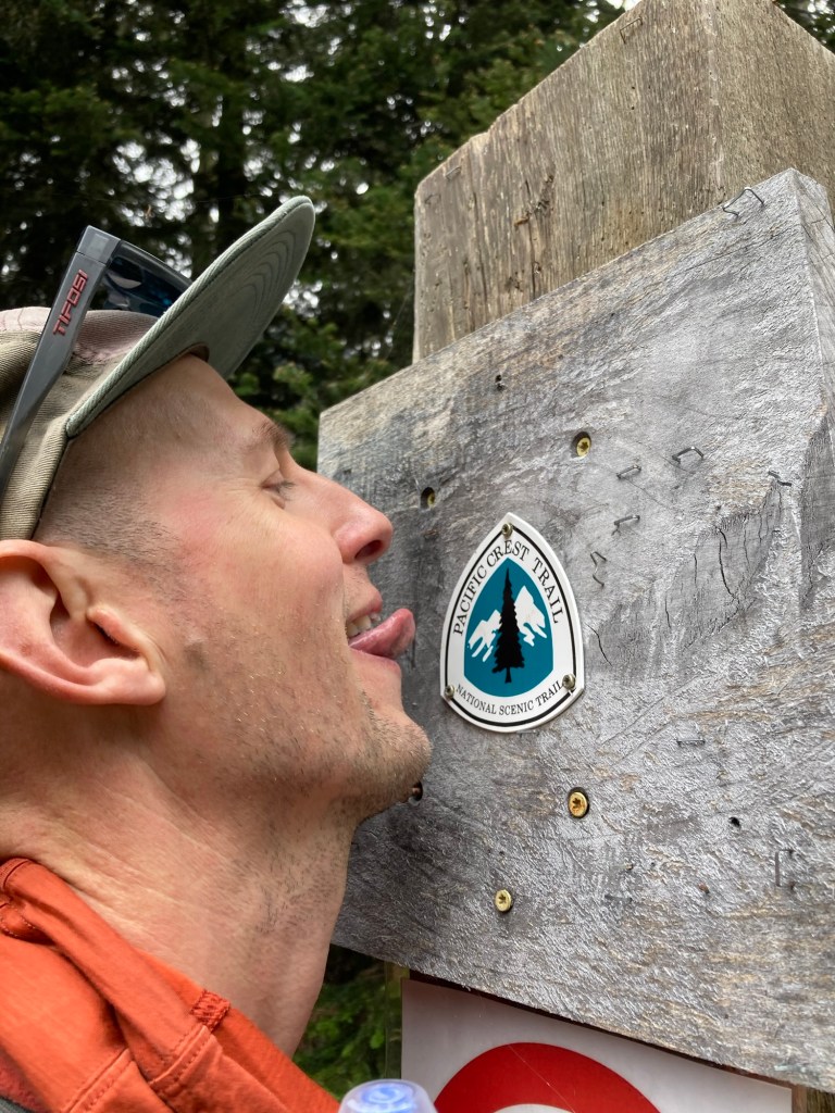 We walk over to the entrance of the PCT where I last set foot on this magical ribbon of dirt. There used to be a blaze on the wooden sign there—I have a photo of me hugging it and puffy-eyed from crying—but someone stole it, or maybe it fell off. The back of the sign still has one, though, and I touch it. Hello again.