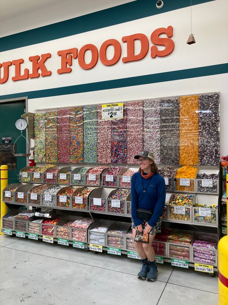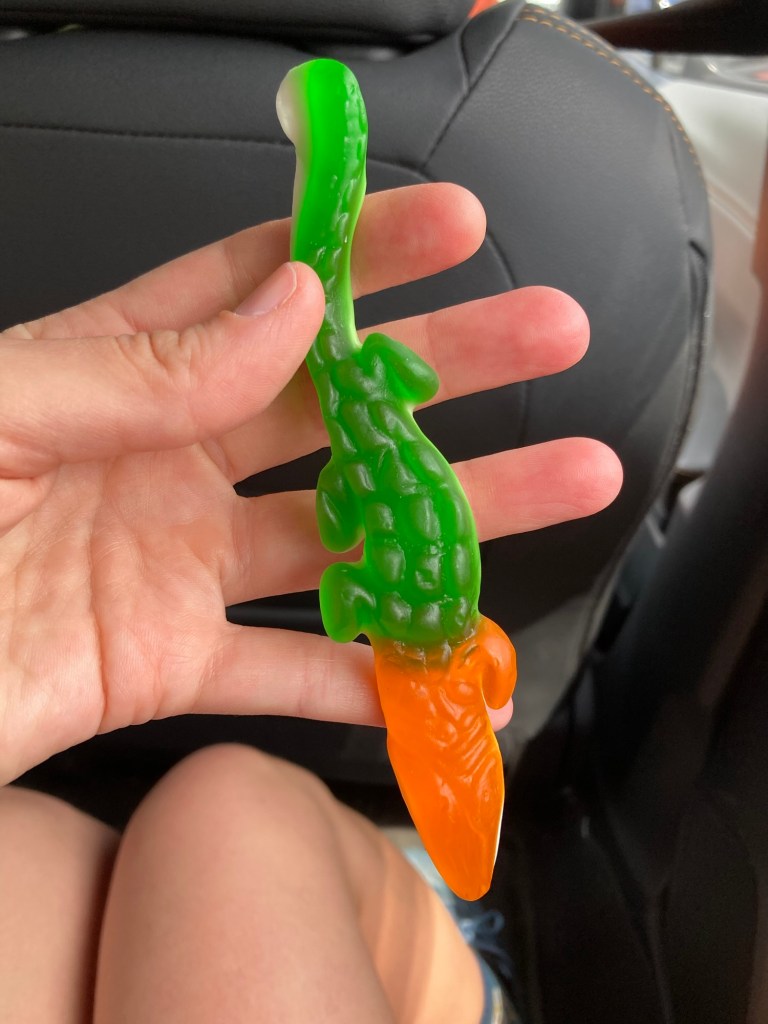 It’s just as magical as I remember, and I exert impressive self-control by only buying only dried hummus mix, a few pink and white animal crackers, and three giant gator gummies, one for each of us, because they remind me of the King Gizzard gator. And they look delicious.