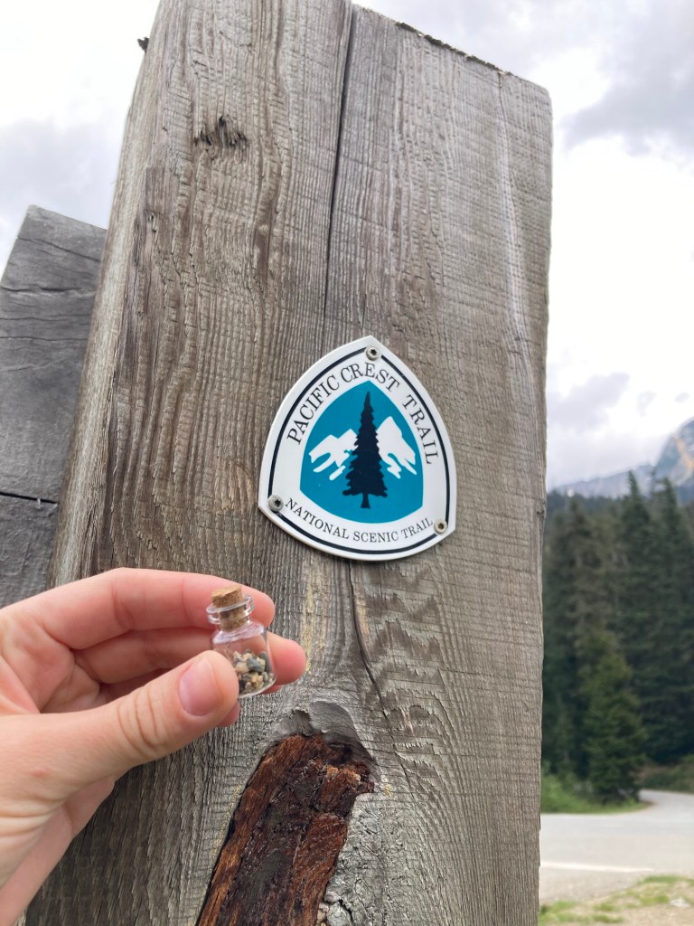 I unzip my fanny pack and root around in it until I find what I’m looking for: a little glass bottle of pebbly dirt. I took this dirt from this exact spot on September 15, 2022. I’m returning it now. I close my eyes, trying to channel the headspace of that day and that moment. Sadness, loss, grief at the end of the trail, but also gratitude, strength, and a heart bursting with love. I wouldn’t want to go back. I don’t want to be in that moment again. But I honor the version of myself that was here on that day. The sun comes out. I uncork the little bottle and tip its contents onto the ground where the PCT meets the trailhead. “I let you go,” I whisper, to no one and everyone in particular.