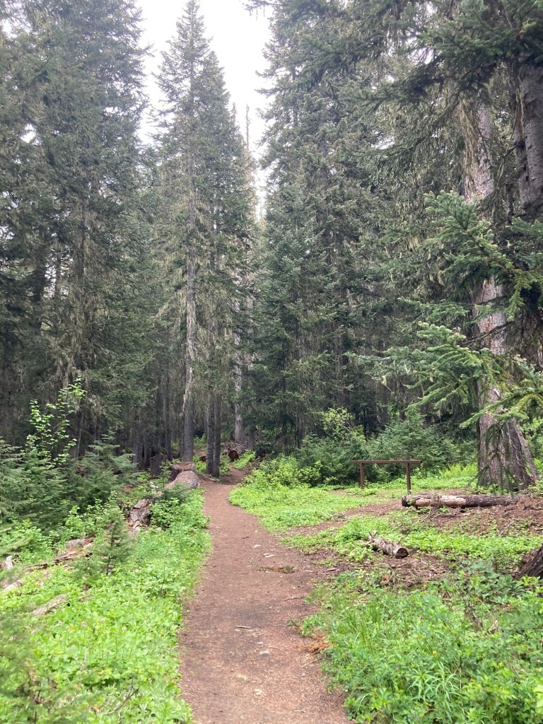 Soft soil path strewn with pine needles and twigs. Rocks here and there. Enormous trees. I take a deep breath and smell that sweet Washington mountain forest smell. Like a giant air freshener, as Rob said. Like a high quality candle, like incense in a holy moment, like every good thing worth living for.