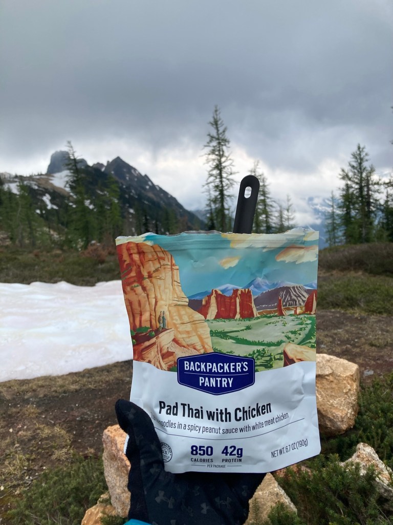 I have to treat myself to a Poshport meal or two, of course, and I couldn’t seem to find my headlamp at home, so I have to spring for a new one. Andy trundles off to pick up his order that he sent in, because of course he thought to do the most time-efficient thing, and of course I’m lollygagging in the dehydrated dinner section like a kid in a candy store. I’m debating whether I need to bring an additional meal to the Peak Refuel chicken coconut curry I already have (food of the gods, that), and as I’m gazing at the Backpacker’s Pantry Pad Thai with Chicken (my second favorite), I hear a voice say, “I heard that one’s pretty good.”