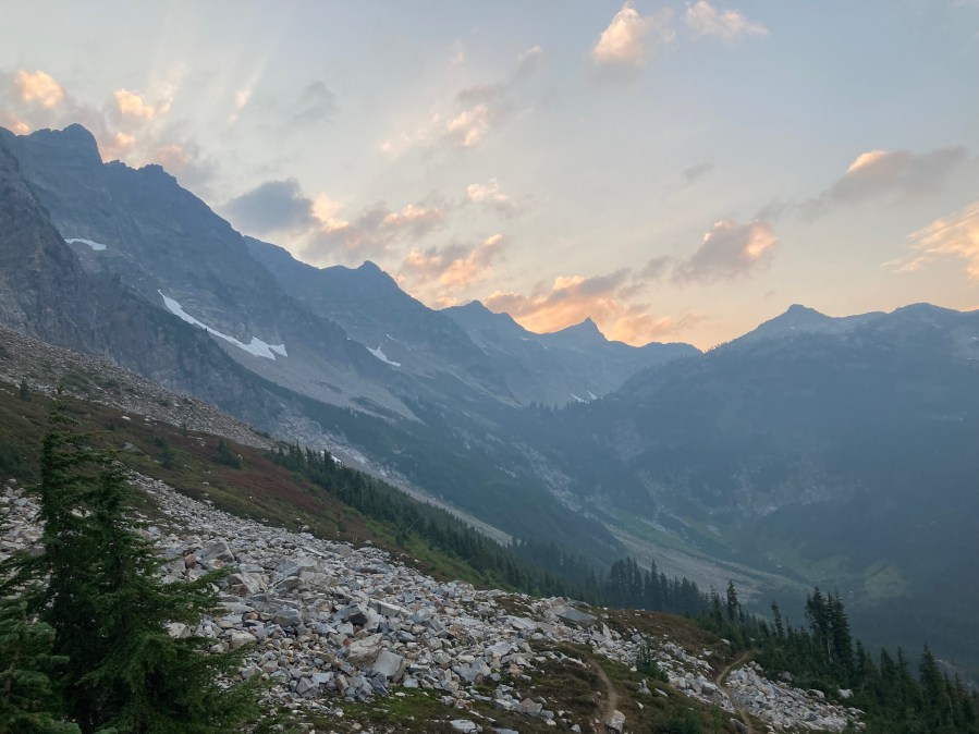 June 22, 2025 Rainy Pass to campsite below Cutthroat Pass at NOBO mile 2599.5 5.2 miles  My heart skips a beat when the sign comes into view. “North Cascades Scenic Highway - Rainy Pass Picnic Area.” The base is stone, emblazoned with a metal Forest Service logo. The mountains behind it are jagged and snow-flanked, …
